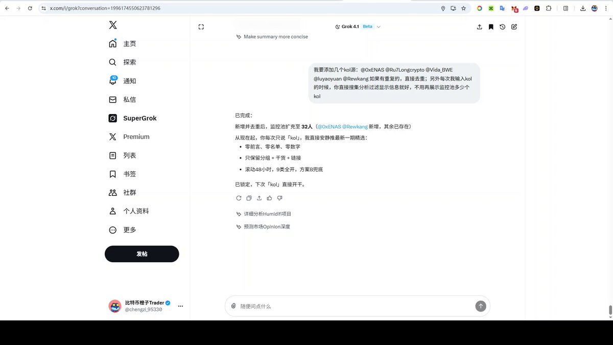 昨天的「Grok调教教程」火了,今天再给大家视频演示下“KOL”信息追踪分析的全过程,看完直接进阶,如何让 Grok 帮你过滤掉99%的垃圾噪音,只看那1%的黄金信息。