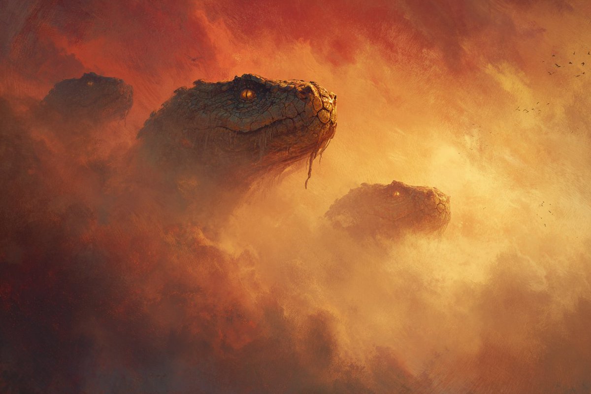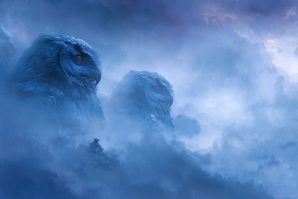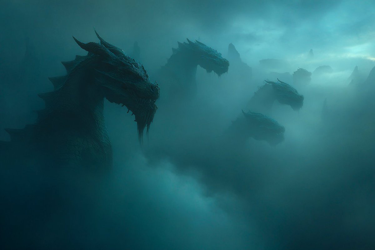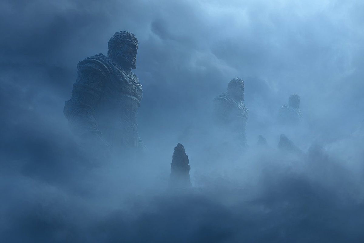 [SUBJECT] depicted as Forgotten Gods in the Mists of Time. Ancient, colossal figures partially obscured by swirling, [COLOR1] and [COLOR2] colored fog. Emphasize a sense of scale and antiquity, with details hinting at forgotten power.