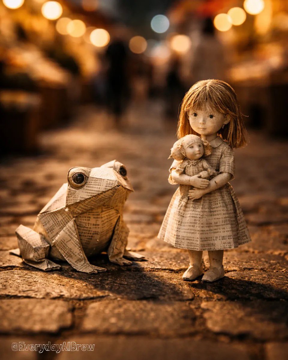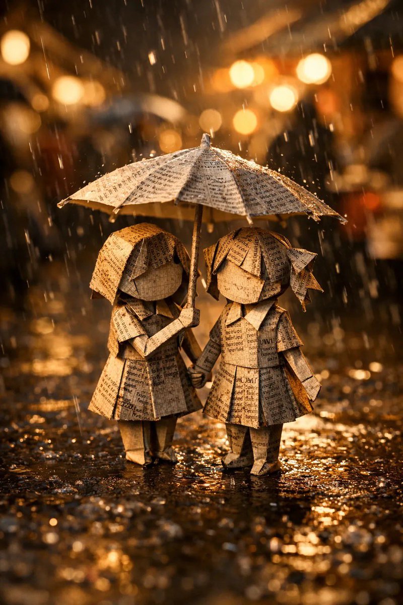 A cinematic, warm-toned realistic photograph on the busy street set in the evening. In sharp focus on the streets of busy market are two handcrafted paper figures made from newspaper: two origami girls under one umbrella holding hands, one girl holds the umbrella. Dramatic top-down natural lighting and rain drops, highlighting paper textures, folds, and typography.
