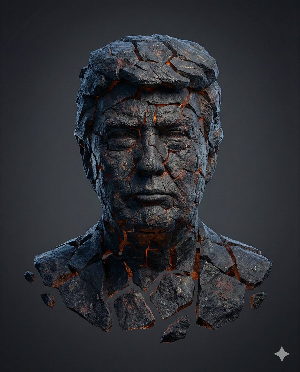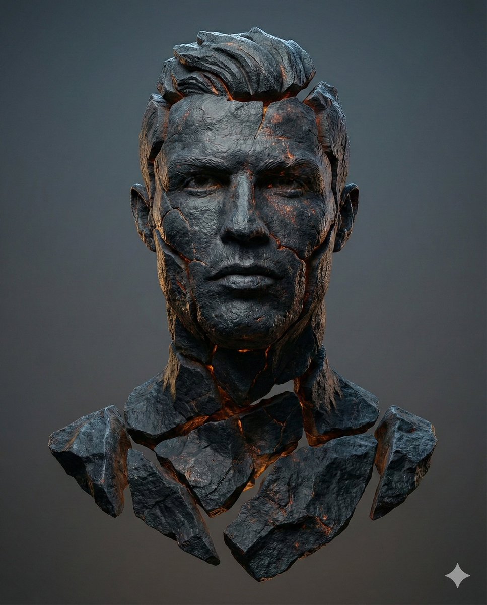 "prompt": "Reimagine the subject as a hyper-real fragmented volcanic basalt construct, assembled from jagged, sharply defined basalt plates suspended in space. Each fragment is fully separated with clearly visible gaps, never touching or fused. Material detail: deep charcoal-black basalt with layered volcanic textures, rough porous surfaces, chipped edges, fine mineral grain, and realistic surface imperfections. Within the gaps only, a subtle internal glow radiates in rich ember tones—burnt orange, molten amber, hints of crimson and gold—suggesting internal heat without any surface glow, lava flow, or melting. Add natural mineral color variation across the basalt, including graphite greys, cool indigo shadows, iron-red undertones, and faint mineral speckling to enhance realism and depth. Lighting: cinematic studio setup with a cool blue-grey top key light defining form and silhouette, combined with a soft warm under-fill that gently reflects ember colors onto nearby fragments. Shadows are realistic and grounded, with precise ambient occlusion in crevices and natural depth between floating pieces. Background: smooth dark neutral studio grey with a subtle vignette for contrast, no texture or distractions. Composition: centered, straight-on, medium framing with a strong, readable silhouette. Preserve the subject’s exact facial identity, proportions, and anatomy from the input image. Ultra-realistic, high dynamic range, cinematic color grading, sharp focus, 8K clarity.",