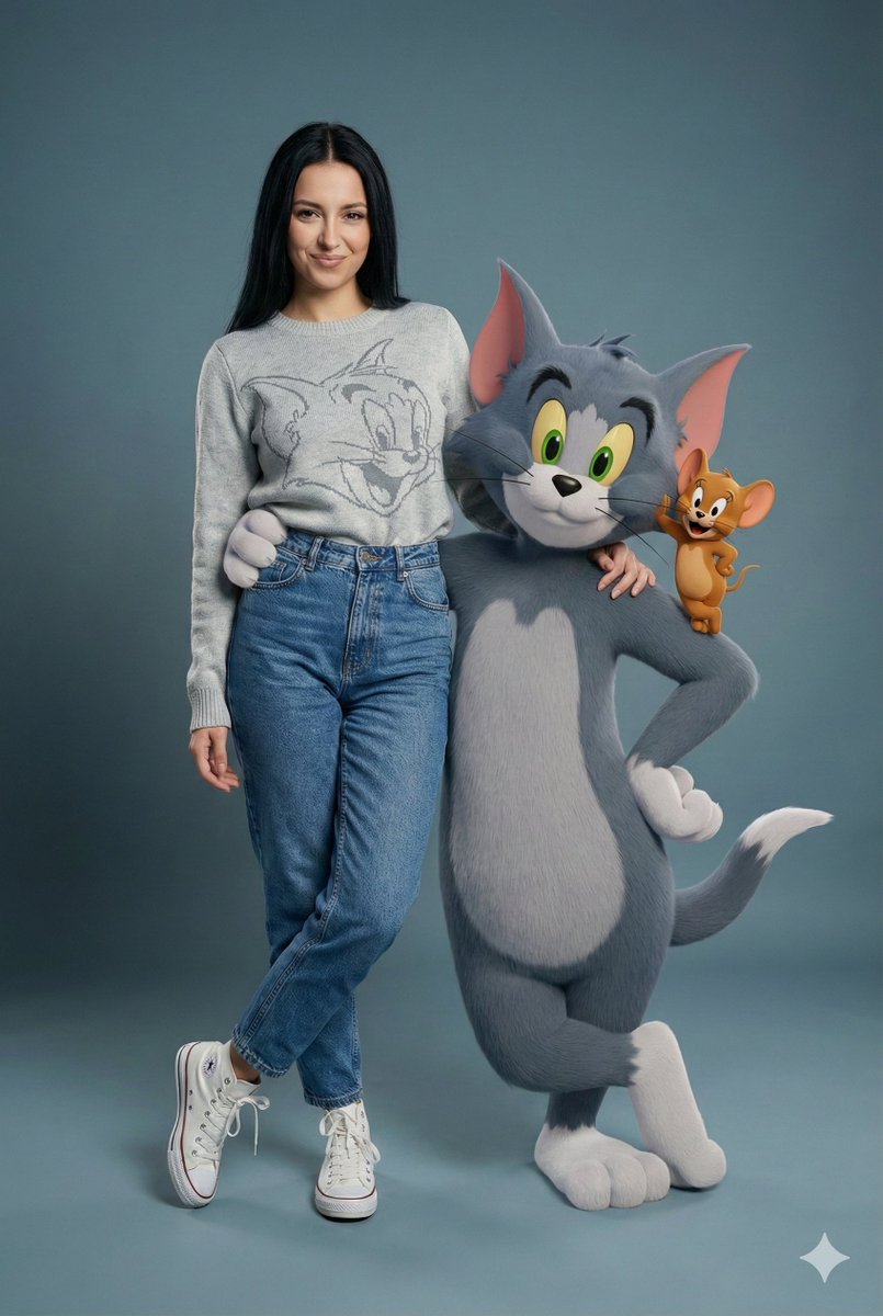 "pose": "standing with arm around giant 3D Tom; Jerry on Tom's shoulder",