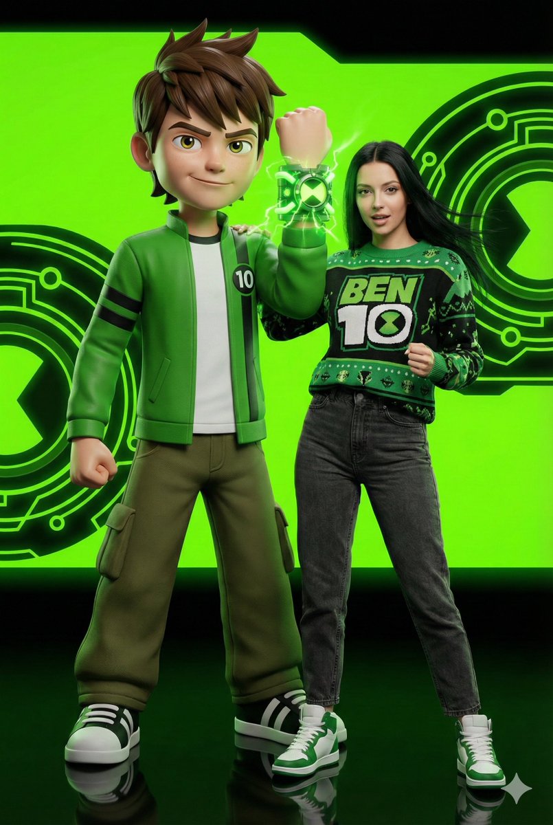 "pose": "standing beside giant 3D Ben 10 activating Omnitrix",