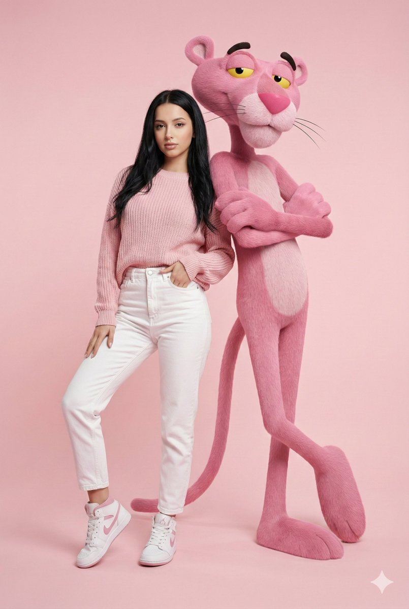 "pose": "posing fashionably beside tall 3D Pink Panther",