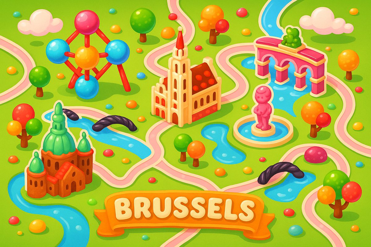 A colorful, playful 2D map of [city name], in the style of Candy Crush Saga, featuring the city’s iconic landmarks as candy-inspired buildings, cute gumdrop trees, licorice bridges, pastel roads, and glossy water elements, floating clouds, vibrant cartoon style, top-down view, kid-friendly game aesthetics, horizontal layout