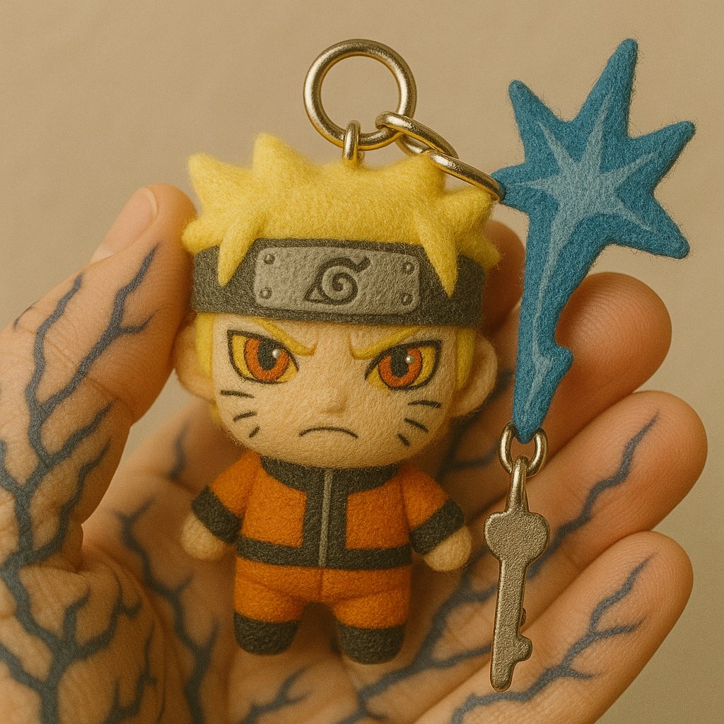 Close-up photo of a small plush keychain of [attached image/emojis]  held gently between two fingers, made of soft felt or fuzzy material, cartoon-style proportions, embroidered face with simple expressive features, character designed to resemble, attached to a shiny silver keyring, neutral beige background, shallow depth of field, soft natural lighting, highly detailed texture, cute and handcrafted aesthetic, studio photography, 1:1 aspect ratio