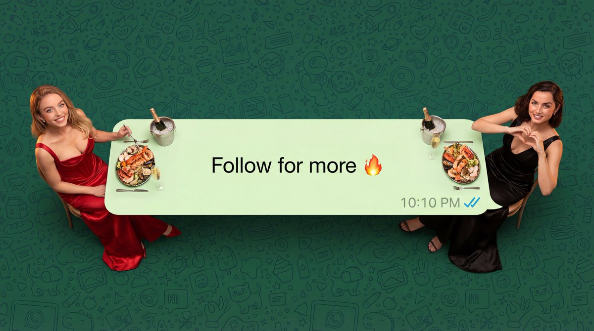 Hyper-realistic top-down macro photography. A long, light green WhatsApp speech bubble acting as a dining table. Two real living humans (shrunk to tiny scale) are sitting at opposite ends. They are NOT plastic figures; they have visible skin texture, natural hair, and realistic clothing folds. They are eating real food that looks freshly cooked, not play-doh. The text inside reads: "INSERT TEXT". Bottom right has a timestamp '3:33 PM' and blue ticks. The background is completely filled with a high-density, seamless WhatsApp doodle pattern (line art icons) covering the entire surface edge-to-edge with no empty spaces, resembling the original dense WhatsApp wallpaper. Professional studio lighting, 8k resolution, sharp focus.