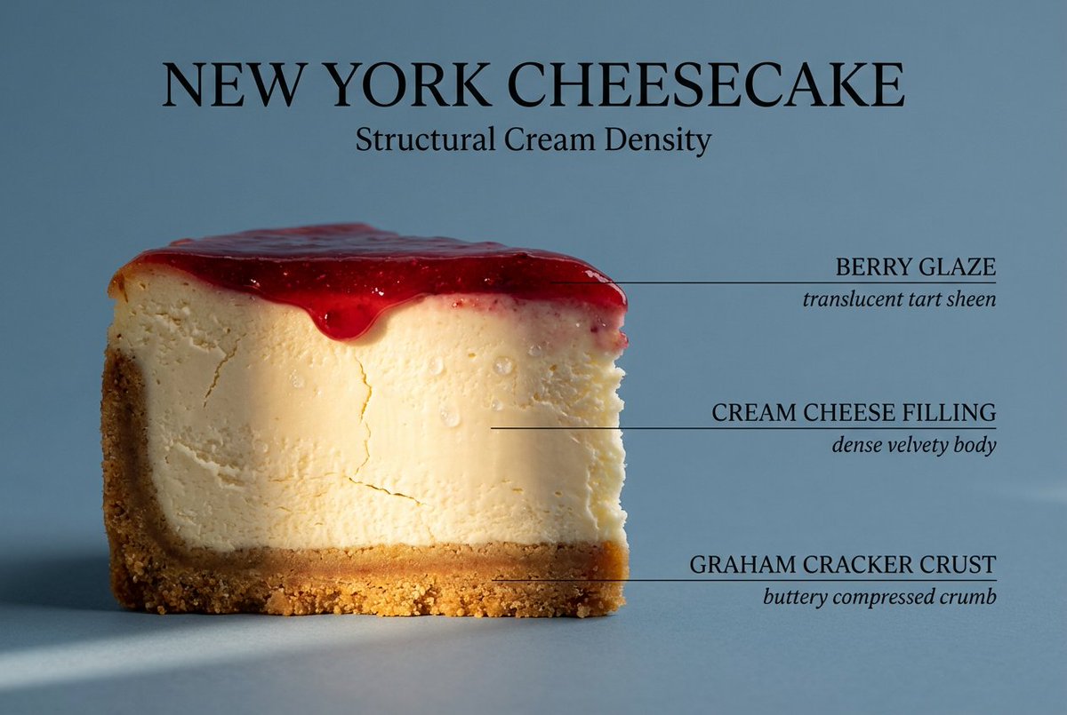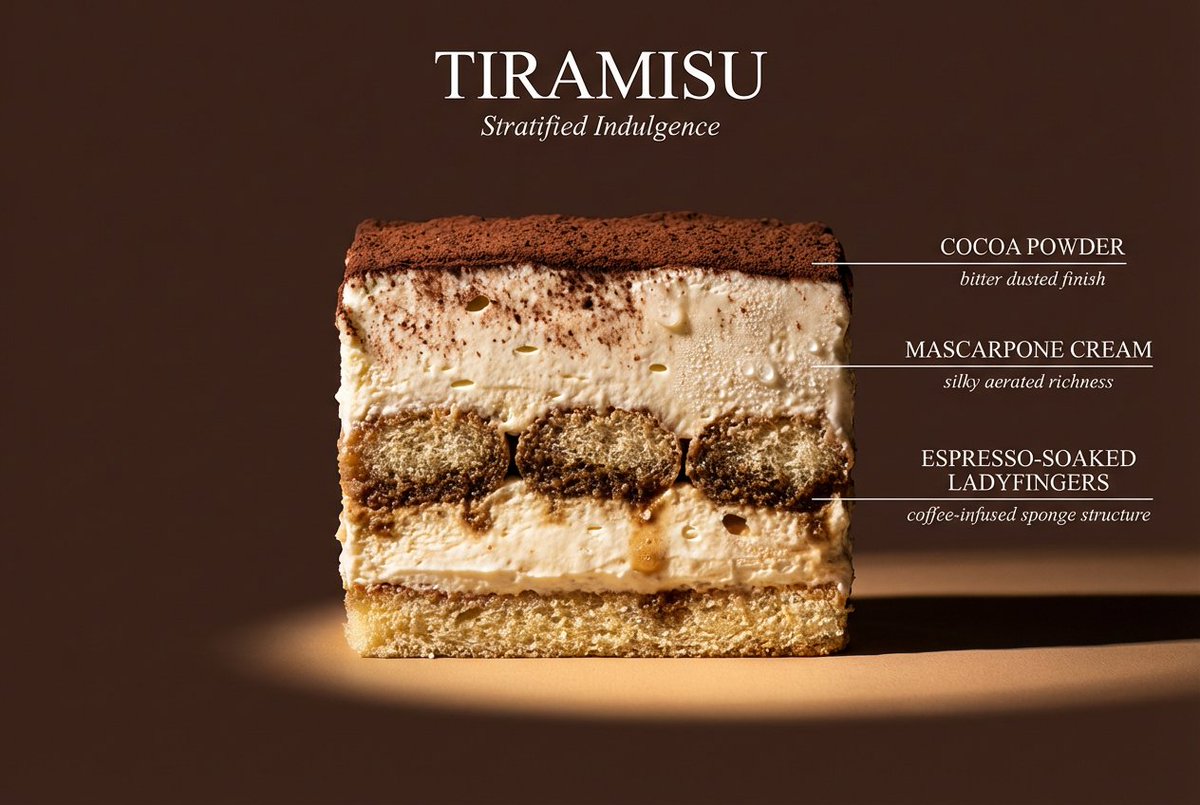Perfect cinematic cross-section cut through [DISH], sliced cleanly down the center revealing every internal layer in full detail. The cut face is facing the camera straight-on, like a geological diagram of flavor. Each visible layer is labeled with a thin horizontal line extending to the right — uppercase sans-serif "[INGREDIENT NAME]" with italic descriptor below. Background: flat matte [COLOR]. Lighting: dramatic side light from left casting long shadows, single warm spotlight on the cut face. Every texture hyperreal — visible moisture, air pockets, char, glaze, and steam. Mood: architectural food photography meets scientific illustration. Dish name "[DISH NAME]" in large elegant type at top. Subtitle: "[TAGLINE]". 4K, tack sharp, Style ref: Wes Anderson symmetry meets Michelin-star kitchen.