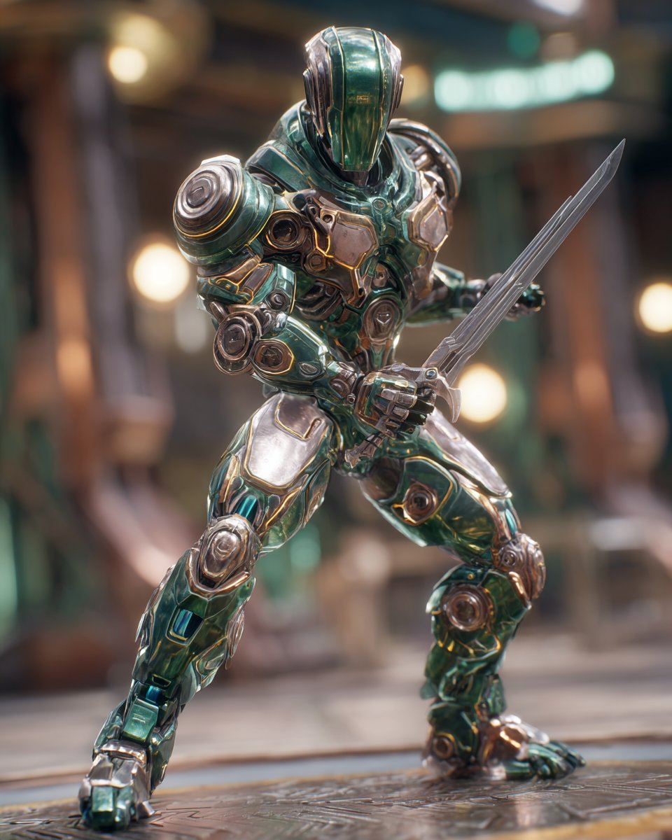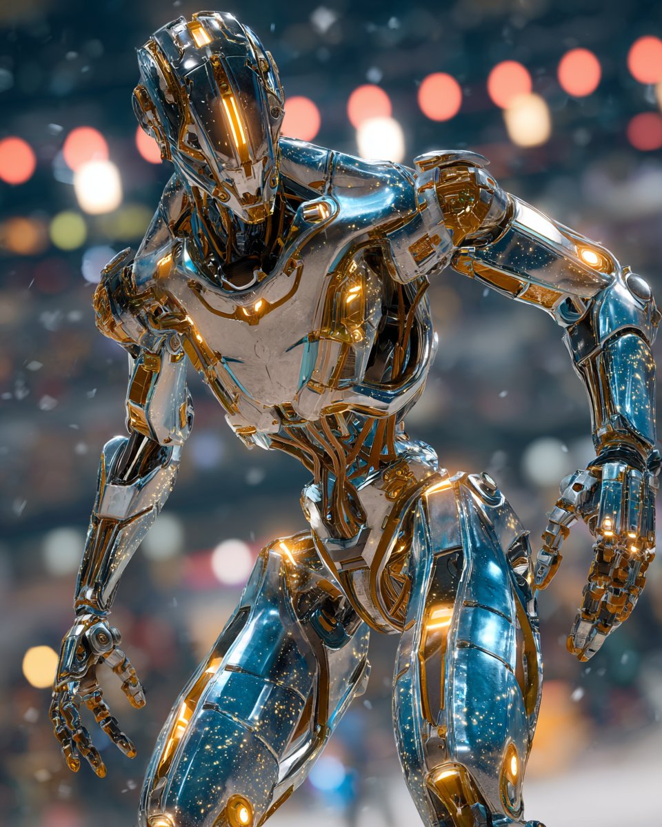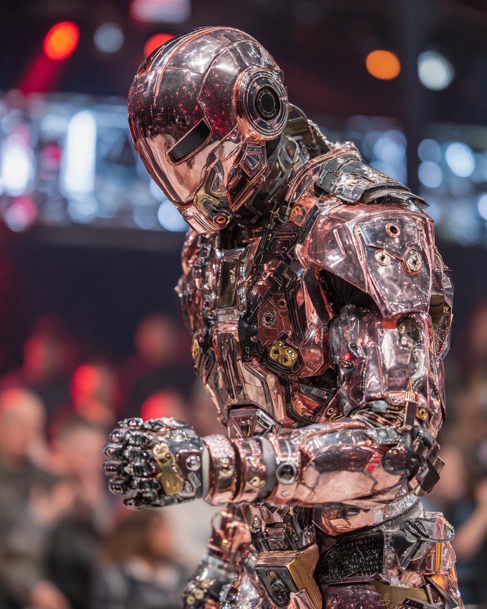 A Metallic Robo-Rogue Showdown portrayal of [SUBJECT], set in a high-tech arena against a formidable cyborg villain. Integrate reflective [COLOR1] plating and metallic [COLOR2] circuitry to spotlight the gleaming, futuristic battle gear