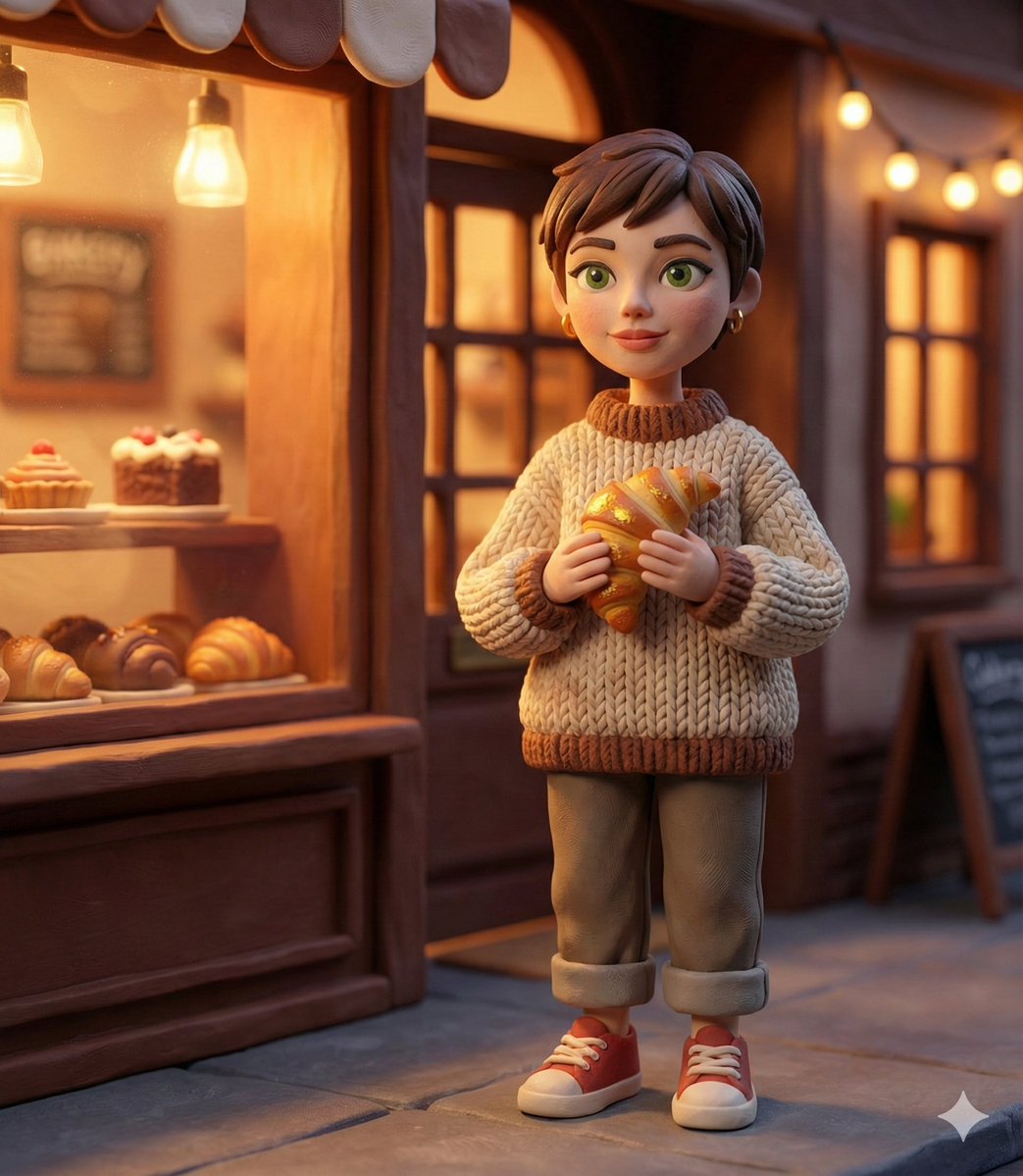 Handcrafted claymation-style character with soft textures and visible fingerprints. Wearing an oversized knit sweater, cuffed pants, and canvas shoes. Standing outside a small bakery with warm window lights, holding a fresh croissant. Cozy evening mood, whimsical proportions, stop-motion film aesthetic.