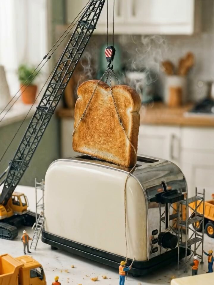Prompt - Ultra-realistic cinematic macro photography of a miniature construction site built around a modern stainless-steel toaster in a cozy kitchen. Tiny construction workers wearing safety helmets guide a detailed crane lifting a perfectly golden, steaming slice of toast from the toaster using metal chains. Visible heat vapor rising from the bread, realistic crumbs scattered on the surface, industrial scaffolding, ladders, trucks, and construction equipment surrounding the toaster. Shallow depth of field, soft natural morning light coming from a window, warm tones, sharp focus on the toast and crane, background softly blurred.