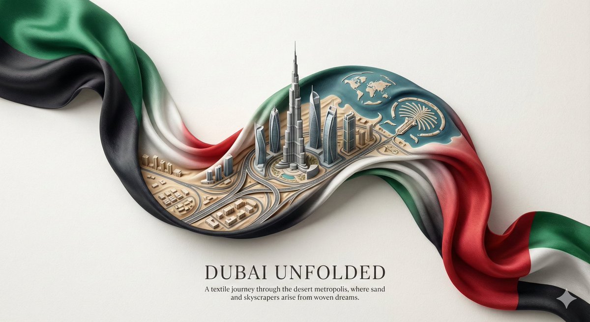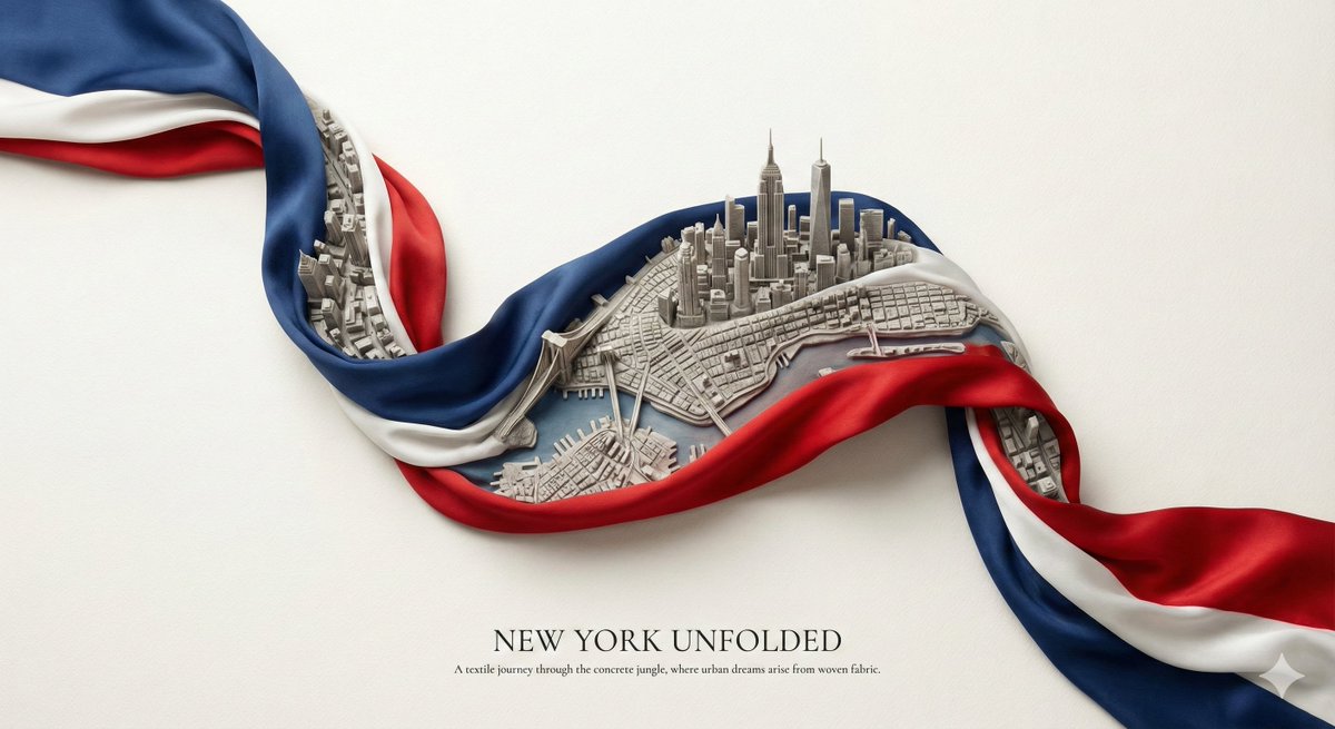 A silk ribbon unfurls diagonally across the canvas, twisting gently in mid-air. Within the folds of the ribbon exists a miniature sculpted city of [CITY], carved as a 3D bas-relief emerging from woven fabric textures.