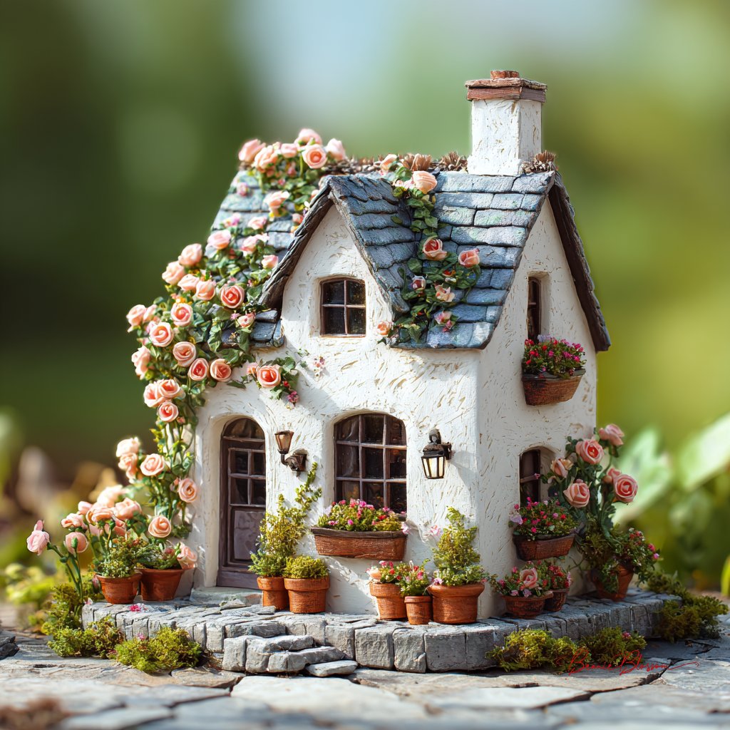 Prompt: handmade white-painted clay house with roses on the roof, flower pots in front of the door and windows, a gray stone path around it, standing on top of a hill overlooking green trees, on a summer day, a realistic photo, high resolution.