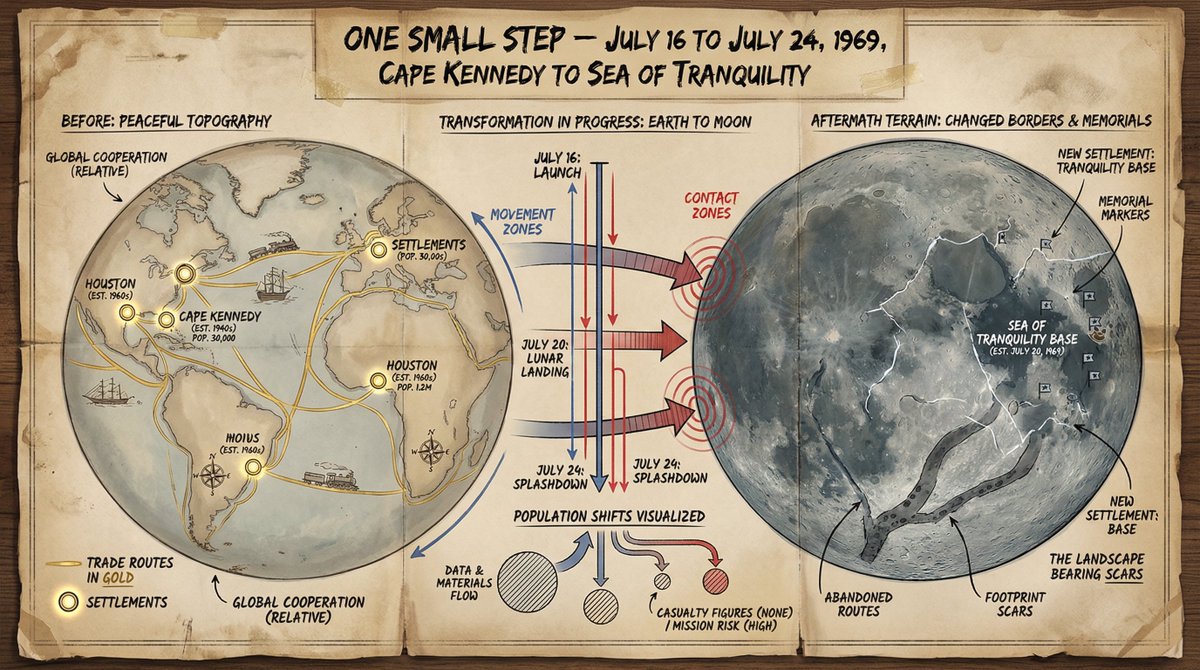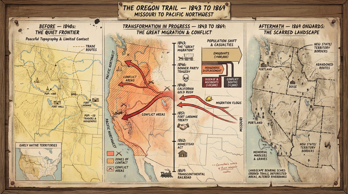 A cartographer's crisis board mapping [CONFLICT / EXPEDITION / MIGRATION] — [ERA / REGION]. Left section: the situation before—peaceful topography, trade routes in gold, settlements marked with period-appropriate symbols, populations annotated. Center section: the transformation in progress—arrows of movement, zones of contact marked in graduated intensity, timeline running vertically with key dates as waypoints, casualty figures or population shifts visualized as proportional flows. Right section: the aftermath terrain—changed borders, abandoned routes, new settlements, memorial markers, the landscape bearing scars of what passed through it. Visual style transitions from pastoral survey calm through urgent wartime graphics to melancholic documentary. Hand-lettered annotations throughout. Title block reading "[EVENT NAME] — [START DATE] TO [END DATE], [GEOGRAPHIC SCOPE]".