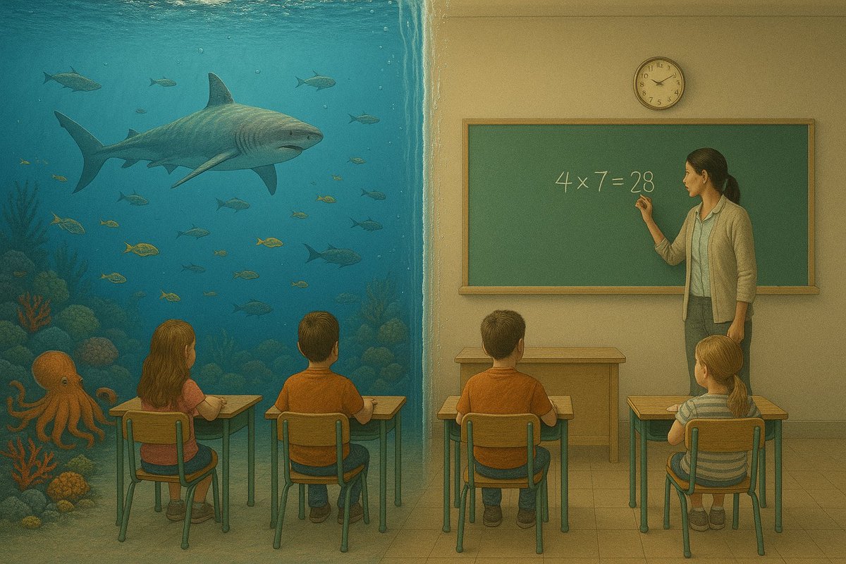Create a surreal split-scene where the left half is an underwater version of a [SCENE], filled with marine life (fish, sharks, octopus, coral, bubbles), and the right half is the regular dry version of the same [SCENE] continuing naturally. Separate the two halves with a vertical wall of water held by a magical force, as if the ocean is cut in half. The scene should align across both sides, maintaining realism while showcasing the impossible scenario. Emphasize lighting and reflection differences between water and air environments.