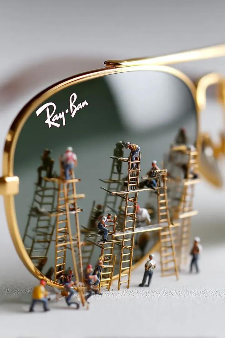 Prompt -  "Ultra-realistic macro photograph of luxury gold-framed aviator sunglasses placed on a clean white surface. The left lens has a subtle dark green tint with a stylish white handwritten logo in the top corner. Tiny miniature construction workers are building and polishing the sunglasses using wooden scaffolding and ladders positioned directly against the lens surface. Some workers are climbing ladders, others standing on platforms adjusting and cleaning the glass. Highly detailed miniature human figures wearing casual work clothes and helmets. The gold metal frame has realistic reflections and smooth curves. Extremely shallow depth of field with soft background blur. Warm natural studio lighting, soft shadows, photorealistic metal textures, tilt-shift effect, hyper-detailed miniature diorama style, 8K resolution, professional macro lens photography.",
