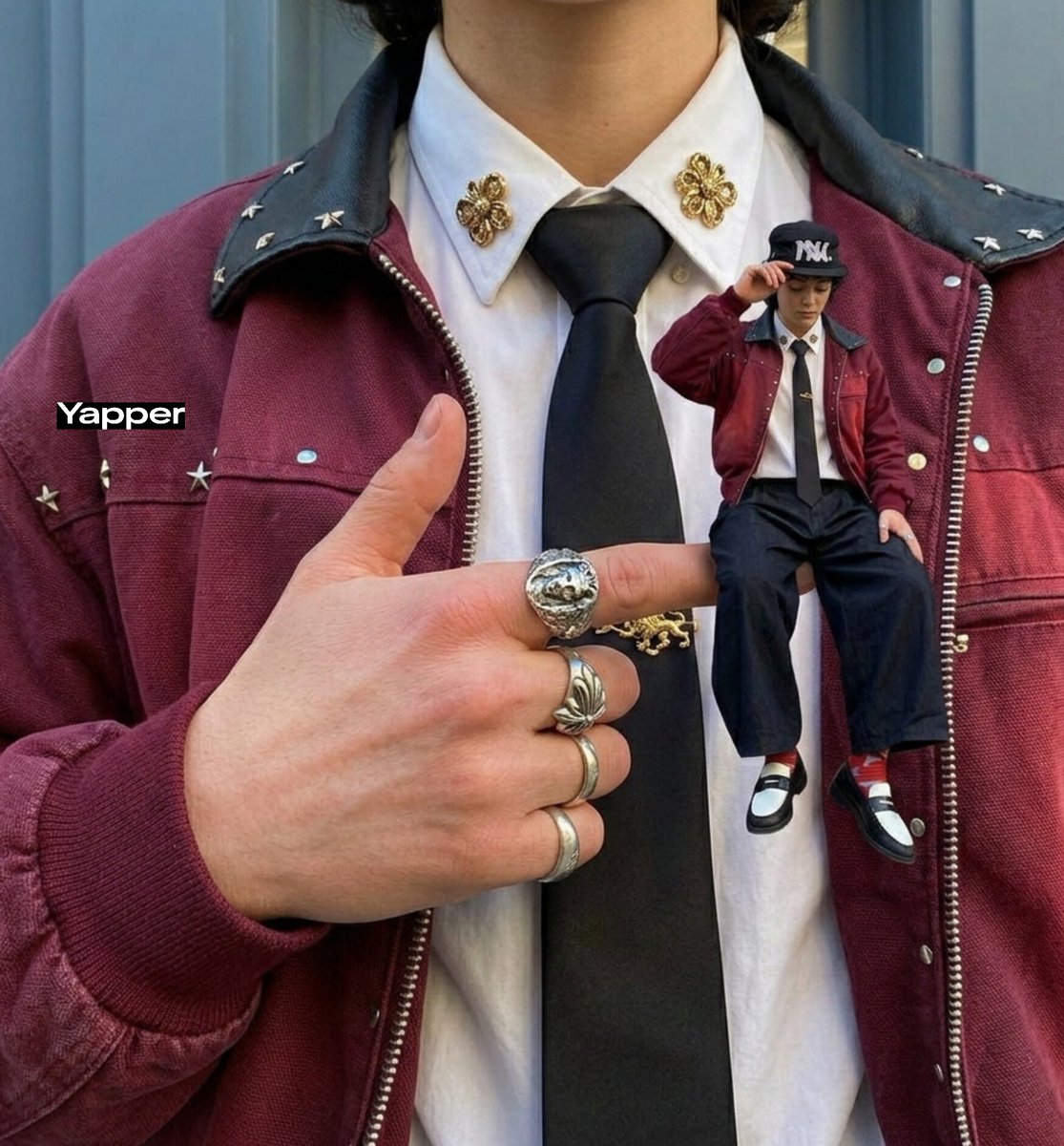 Ultra-realistic surreal fashion composition of a stylish young woman miniaturized and sitting on a fingertip, creating a dramatic scale contrast. Close-up macro shot of a woman’s torso wearing a deep burgundy textured jacket with silver zipper and metal studs, crisp white shirt, sleek black satin tie with ornate gold tie clip, and a decorative crest pin on the collar. Her hand is slightly raised, wearing bold silver statement rings and a thick metallic thumb ring.