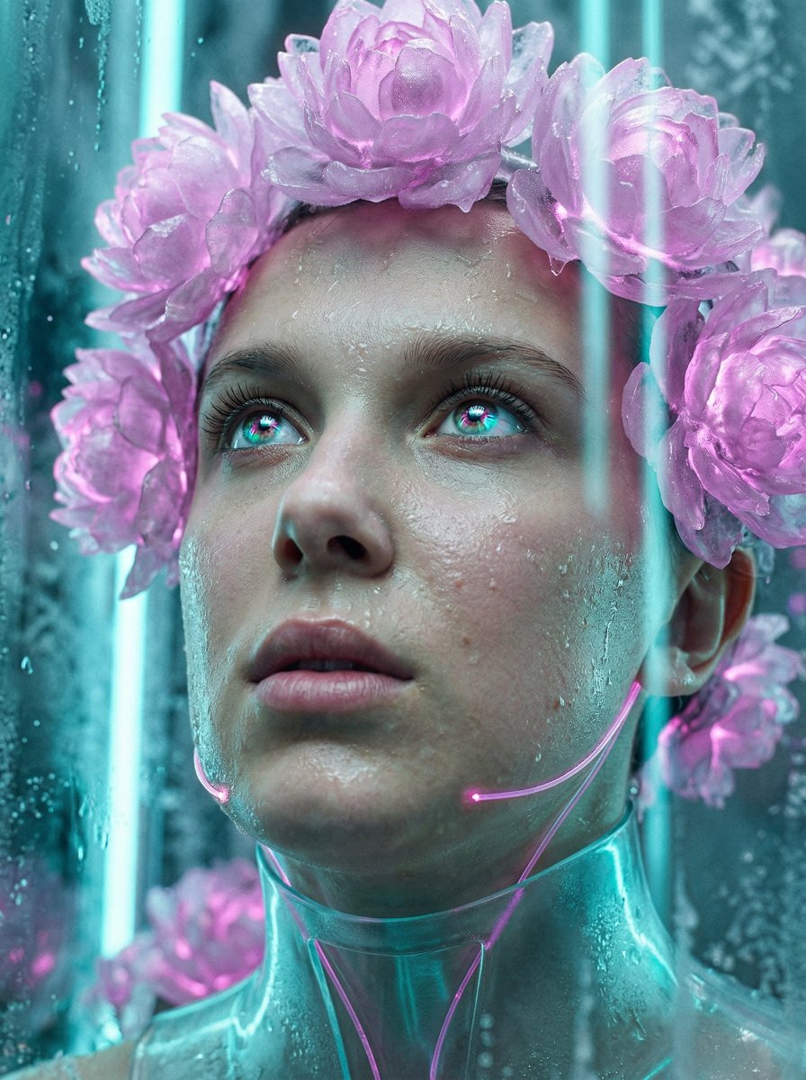 "master_prompt": "A hyper-realistic extreme close-up of The Visionary in a Cryogenic Floral Archive. The subject looks slightly upward with a hopeful, determined expression, catching the light of a distant bio-reactor. To mirror the surreal inspiration, the subject is crowned by a practical-effect halo of frozen, crystalline peonies emitting a soft magenta phosphorescence, replacing natural hair with a sculpture of ice and light. Vertical shafts of cyan light slice through the humid air, creating prismatic reflections in the subject's wide eyes. The skin texture is raw and porous, glistening with thawing condensation droplets. The scene eschews digital flatness for physical depth, treating the glowing flowers as tangible fiber-optic props. Shot on a Hasselblad H6D-100c with a 120mm Macro lens at f/2.8 to isolate the eyelashes and iris. The lighting is a mix of cool cathode cyan rim lights and warm organic magenta fill, creating a high-budget cinematic sci-fi aesthetic. Emulate Cinestill 800T film stock for subtle red halation around the glowing flora.",
