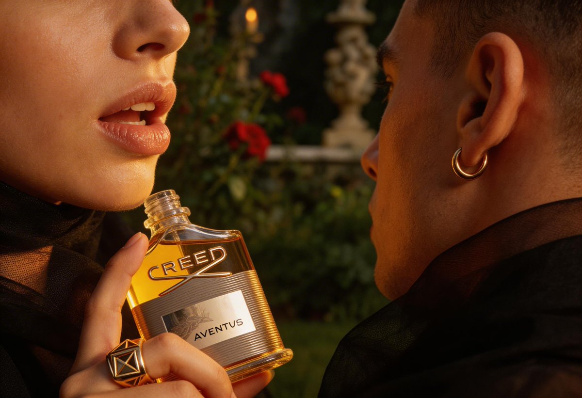 A hyper-realistic, high-end fashion editorial close-up shot focusing on tactile intimacy. The composition is an extreme close crop capturing the tension between two women: on the left, a pair of lips are slightly parted in a mid-whisper motion; on the right, an ear with a minimal gold cuff listens. Held delicately in shot just below the chin of the whiperer is a bottle of Creed Aventus, slightly backlit so the liquid glows. The figures are wearing ambiguous black silk riske garments, blending into the deep shadows. The setting is a moody, dark Venetian garden reminiscent of the Garden of Eden. Lighting is cinematic and warm (2900K), simulating candlelight that catches the texture of the skin, the gold architectural ring on the whisperer's hand, and the rim of the listener's ear. Shadows are crushed deep black for sophistication. Shot on Fujifilm 35mm f2, capturing visible pores, sun-kissed skin tone, sweat sheen, and film grain.. Visual References Gucci Garden Aesthetic: Alessandro Michele era Gucci: Overgrown maximalism Renaissance painting meets surrealism Rich jewel tones (emerald, ruby, gold) Decay and beauty coexisting Baroque excess but tasteful Specific campaign references: Gucci Bloom (garden imagery, lush flora) Gucci Guilty (Eden symbolism, forbidden pleasure) Glen Luchford for Gucci (surreal narrative, rich color) Photographer Style References: Tim Walker: Theatrical garden sets Impossible scenarios in nature Romantic excess, fairy tale quality Large format, painterly Solve Sundsbo: Transformation effects (dissolving, materializing) Precision in surreal moments High-gloss finish Paolo Roversi: Soft focus romanticism Timeless garden settings Painterly light quality Petra Collins: Dreamy gardens Feminine gaze Soft surrealism