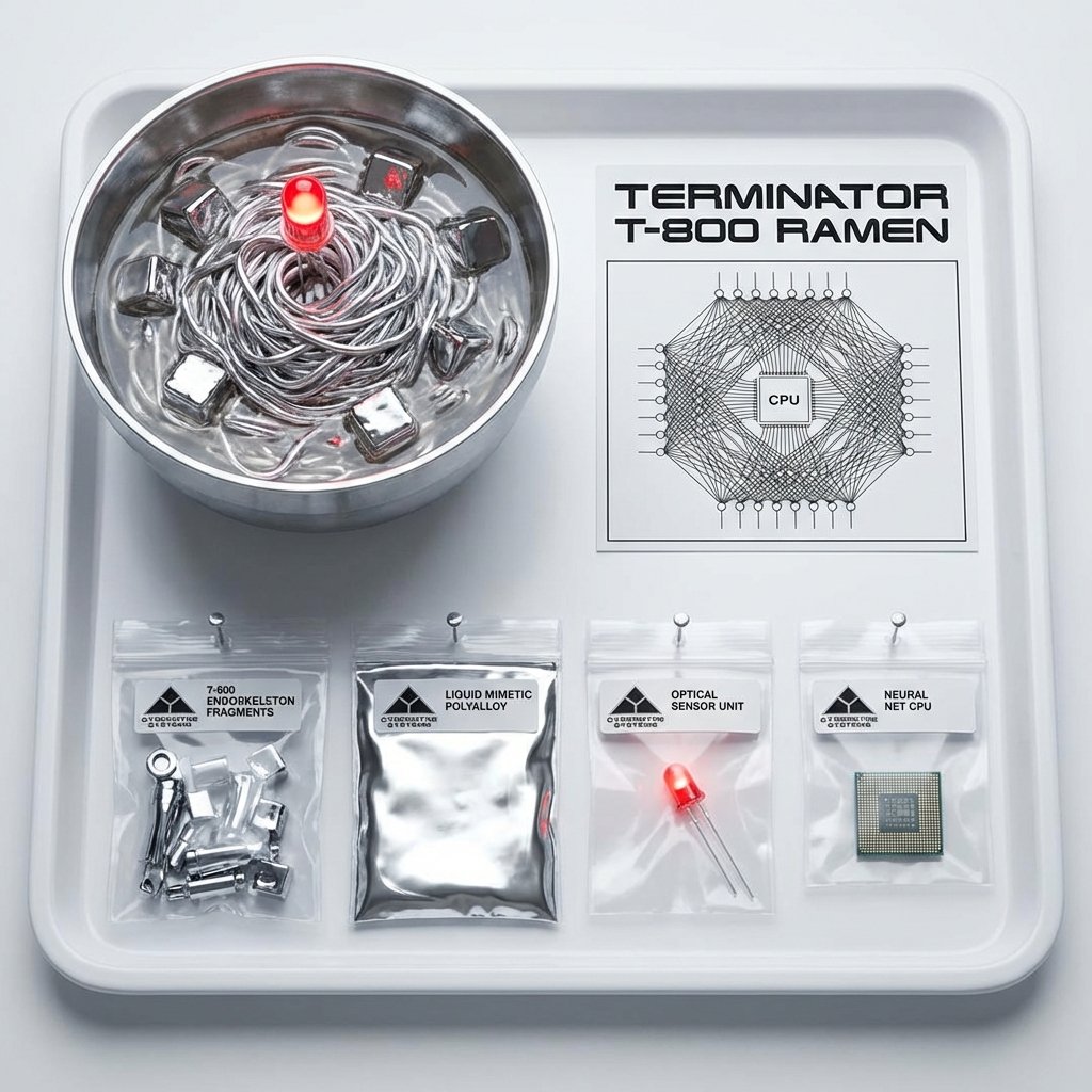Detail: The "Garnish" (Step 1) physically emerges from the food (e.g., a Xenomorph head rising from the ramen broth).