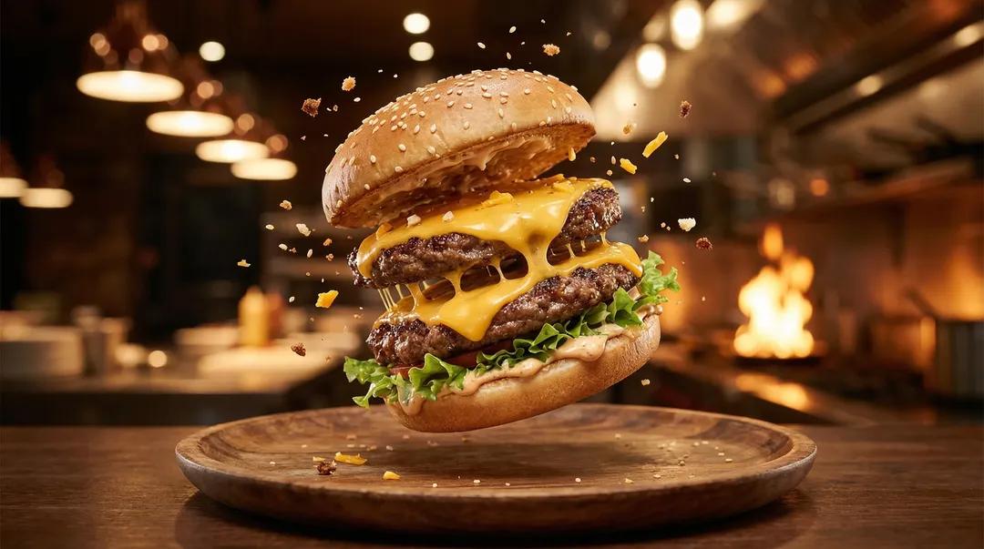 A massive artisanal ice cream cookie sandwich caught mid-air as it smashes down onto a marble countertop. The two large chocolate chip cookies are cracking, with chunks flying. A thick puck of vanilla bean ice cream is squishing outwards, glistening with condensation. Ultra-realistic hot fudge sauce and salted caramel are stretching and dripping messily down the sides. Chocolate shavings, cookie crumbs, and sea salt flakes are suspended in the air around the impact.