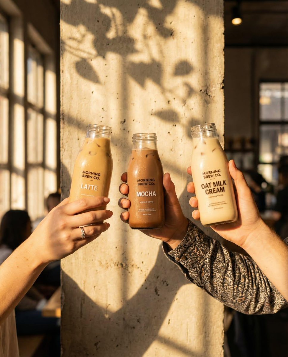 Three hands holding iced coffee bottles (latte, mocha, oat milk), warm golden hour sunlight, cafe interior background, soft shadows of leaves on wall, cozy atmosphere, realistic reflections, lifestyle product shot, cinematic warm tones, shallow depth of field, 8K.