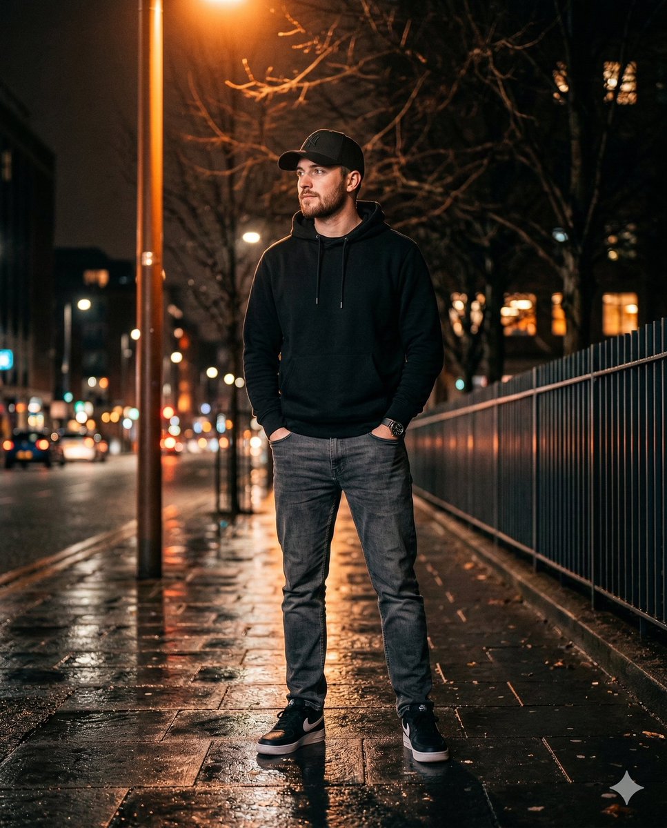 一位时尚年轻男士的超逼真夜间照片 - AI Image Generation Prompt | Pixshop AI