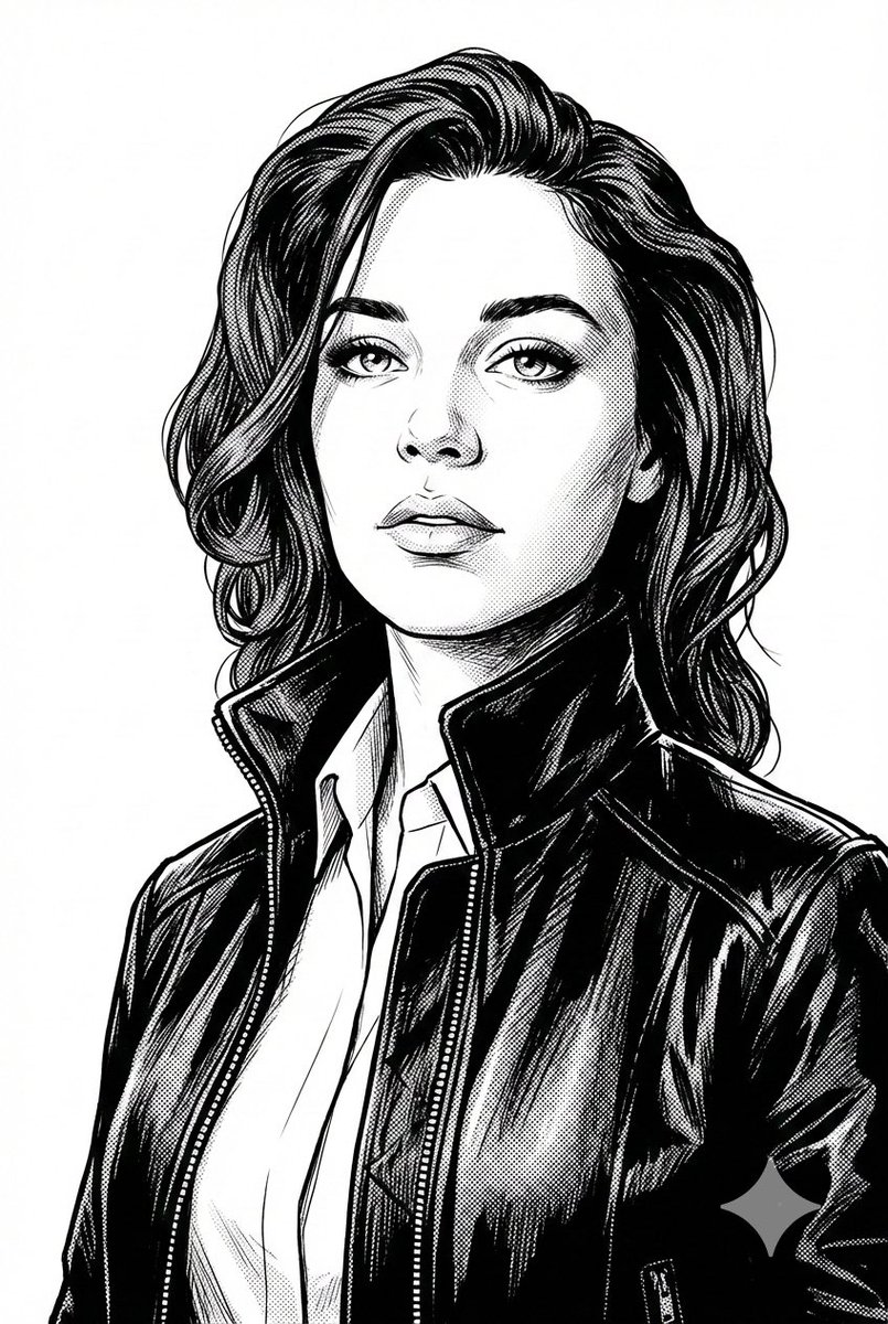 A portrait size image of highly detailed black and white digital illustration in a comic book or vector art style, depicting a person ({argument name="person" default="uploaded photo"}) she has a calm expression. Her eyes are gazing upwards and slightly to the side. She is dressed in a formal collared shirt underneath a zipped-up leather or bomber-style jacket with a high collar, rendered with clean lines, high contrast shading, and cross-hatching for texture. The background is plain white, focusing entirely on the bust portrait from the chest up, angled slightly from below to emphasize her upward gaze. Style reminiscent of noir graphic novels or modern pop art portraits, monochromatic with gradients from pure black to white.