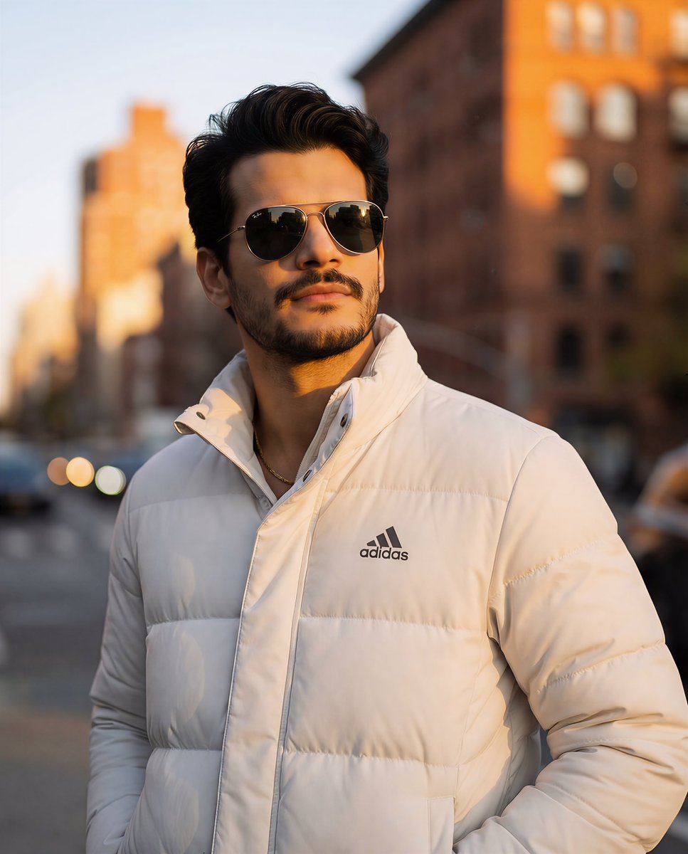 Outfit: matte white Adidas padded puffer jacket with clean stitching and subtle fabric texture, high-quality finish, minimal branding visibility. A thin, subtle gold chain rests naturally around the neck, adding a refined luxury detail.