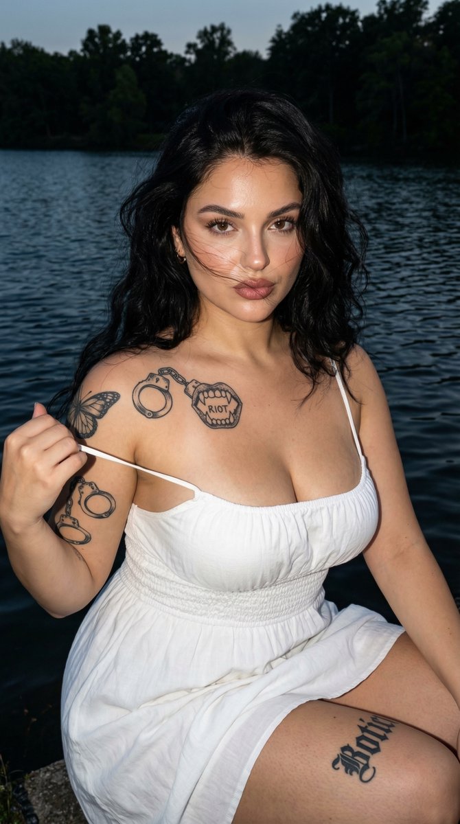 "description": "Well Endowed Young Woman (From Uploaded refrence Image), with thick wavy dark hair and extensive black ink tattoos on her arms and leg.",