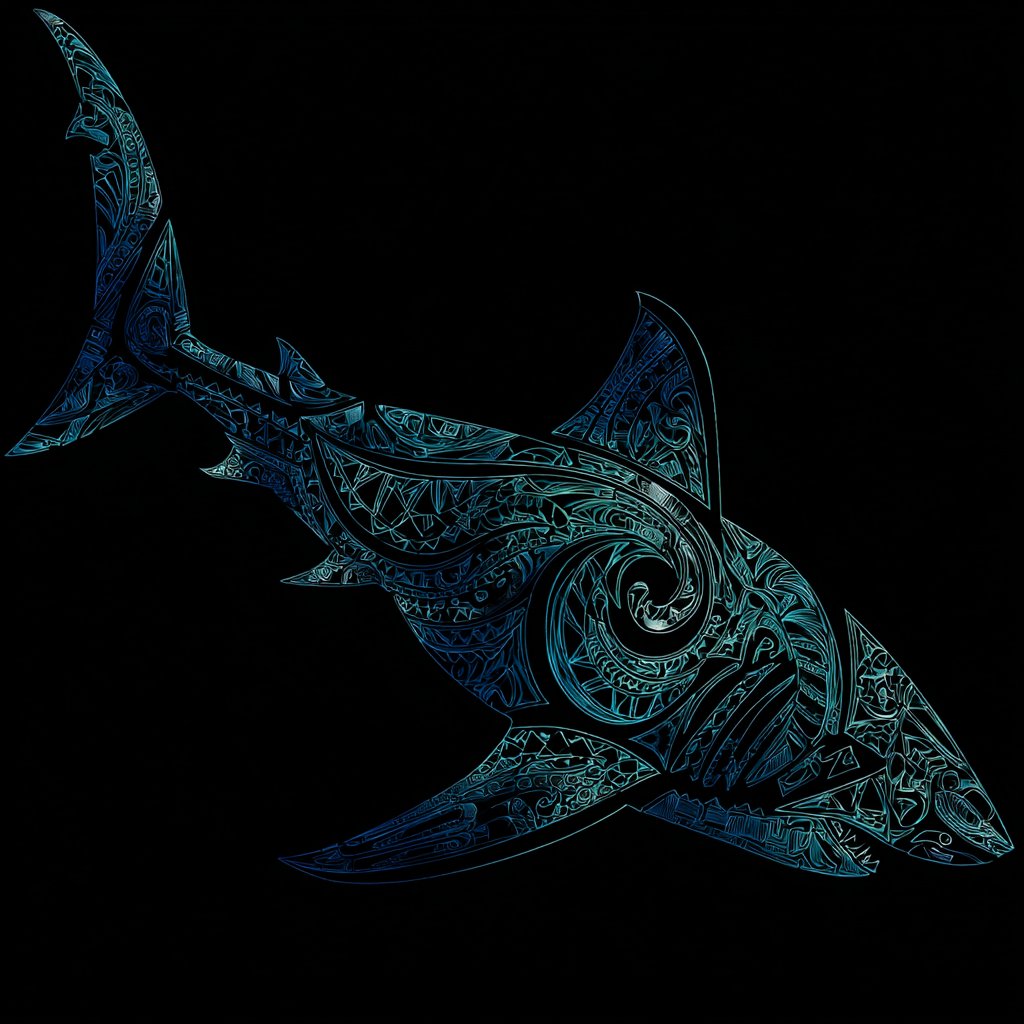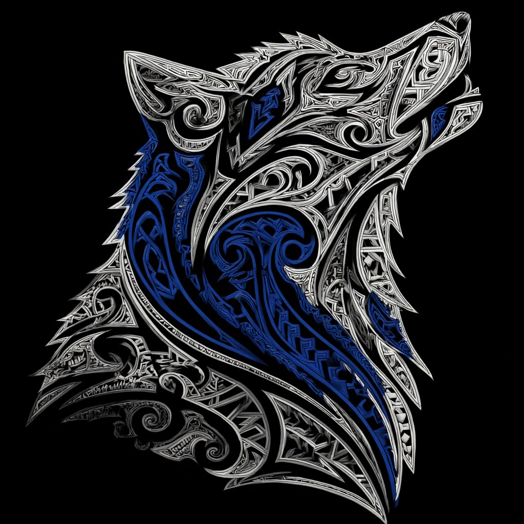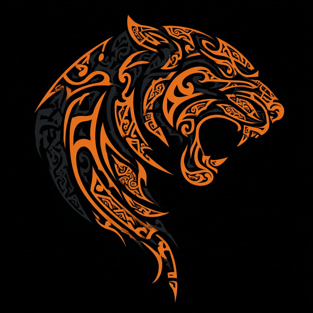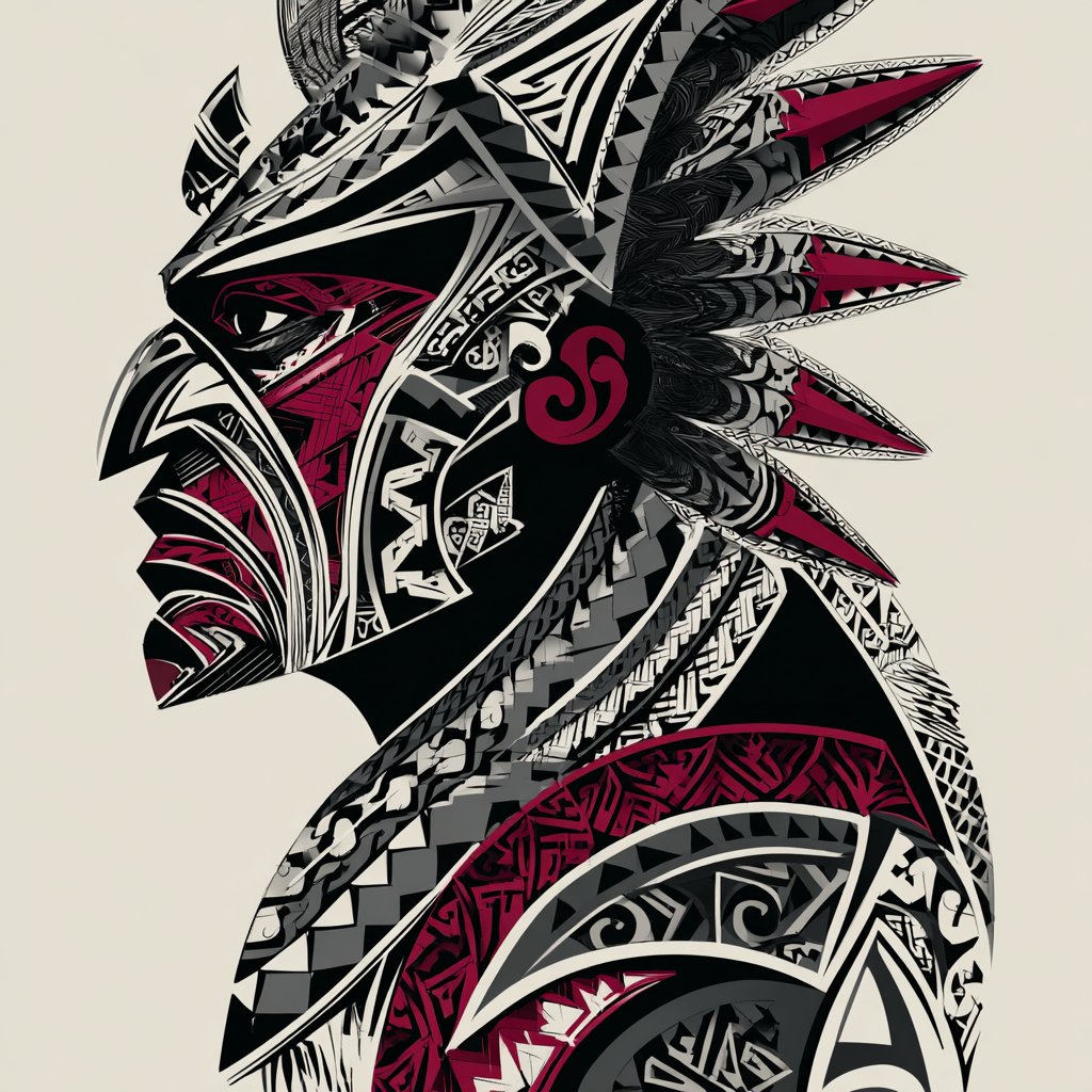 A Fractal Maori Tattoo Design of [SUBJECT], with bold, black fractal patterns inspired by traditional Maori art. Use [COLOR1] and [COLOR2] as accent colors within the fractal patterns, creating a striking visual contrast.