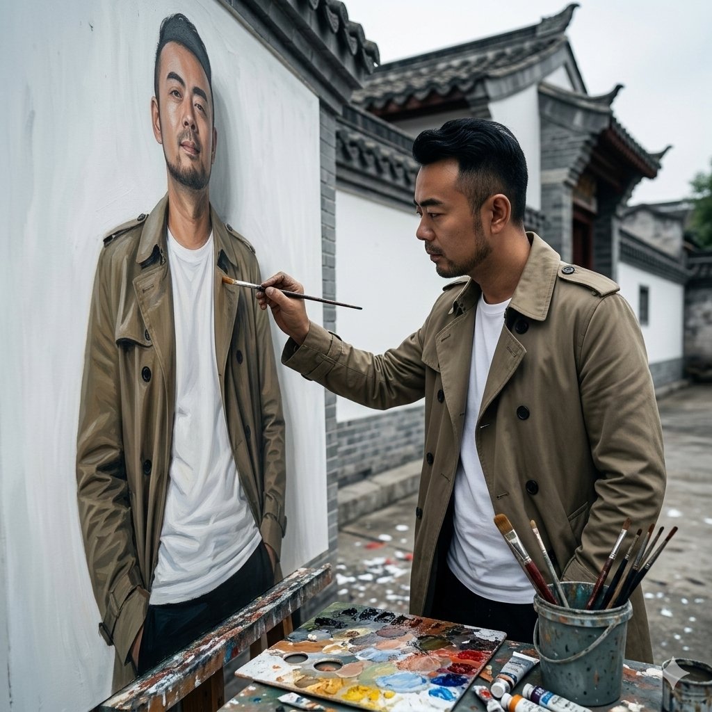Subject & Action: A cinematic, painterly portrait of the man from the uploaded image, intensely focused as he paints a large-scale mural of himself. He holds a paintbrush, meticulously adding fine details to a life-sized self-portrait on a white wall. Both the artist and his mural counterpart are wearing identical outfits: a tan double-breasted trench coat over a white t-shirt.