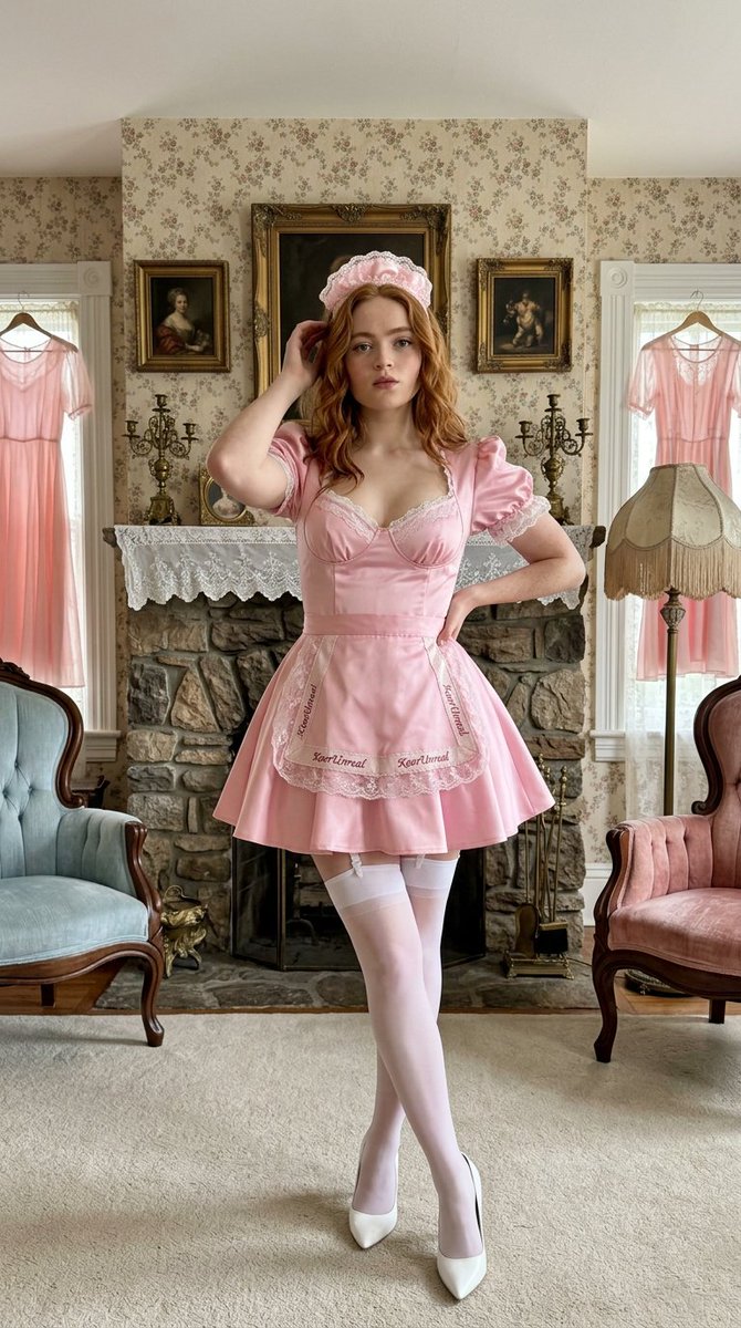 “description”: “A tailored {argument name="outfit color" default="pink"} satin open maid uniform with deep neckline. It features a fitted pink satin bodice with puff sleeves and lace trim, an attached full pink satin skirt with a layered structure, and a pink satin apron with matching pink lace detailing, a embroidered sign 'KeorUnreal' on borders. She wears white thigh-high stockings with a subtle garter detail and pristine white stiletto high heels.”,
