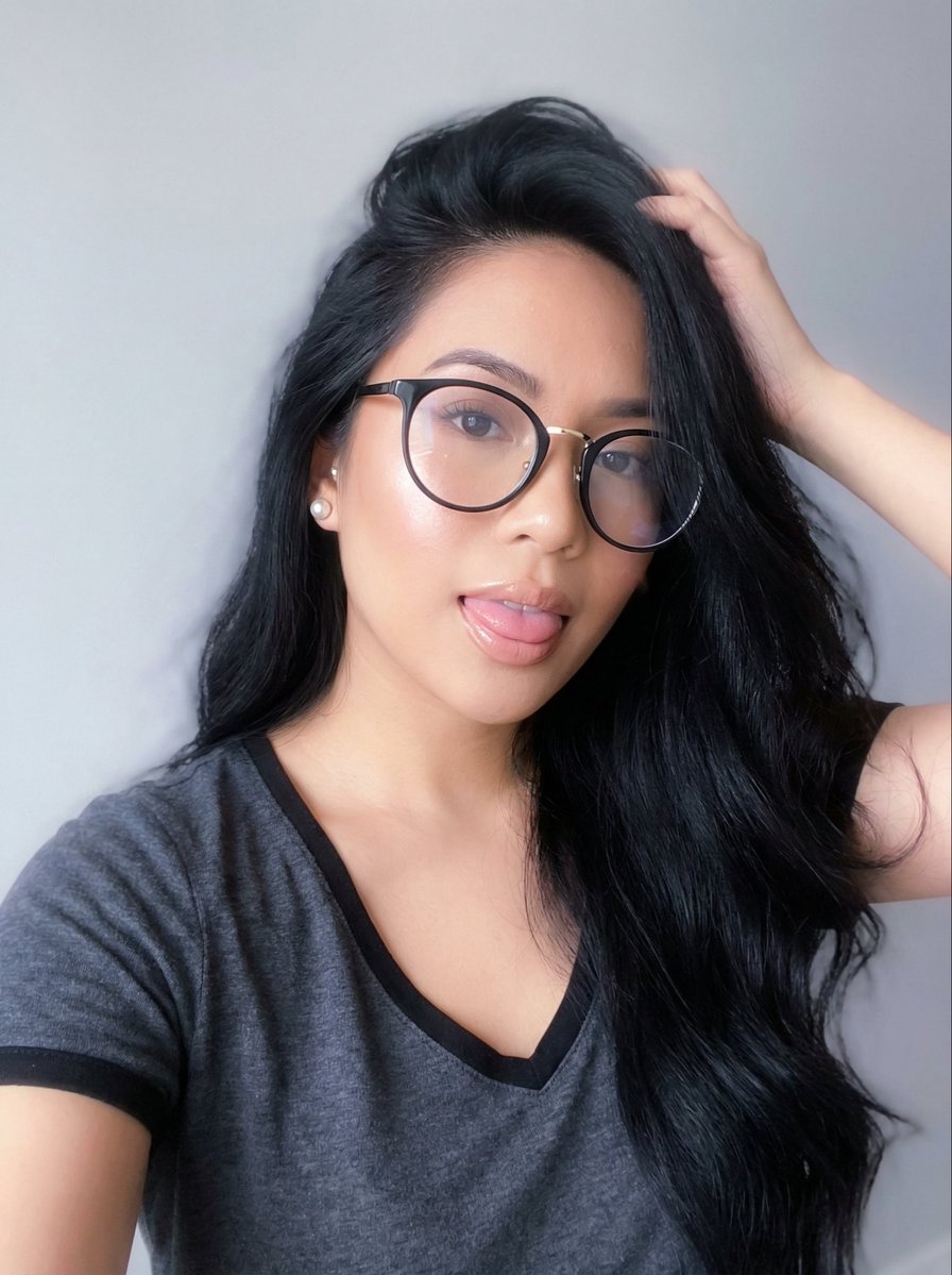“eyes”: “large dark eyes behind glasses with soft reflective highlights”,