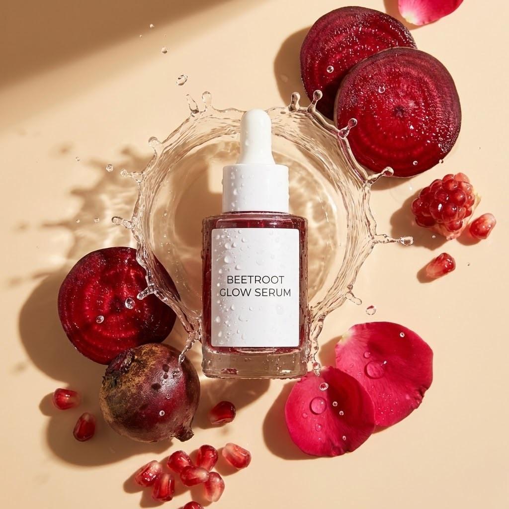 Prompt: [product], centered top down flat lay, surrounded by [ingredients], fresh slices and whole pieces, glossy wet look, water splash frozen mid motion around the product, dewy droplets on label and surface, warm beige seamless background, soft directional sunlight, crisp realistic shadow, high end skincare advertising, ultra realistic macro product photography, 100mm lens look, f/8 sharp focus, clean composition, no extra text, 8k, 1:1