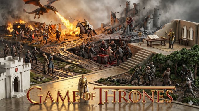 **No frames, no borders, no cross-sections.** Lighting is cinematic and volumetric. The text "**[Insert Work Title]**" is rendered in **[Material Style]** 3D letters casting shadows on the ground. Tilt-shift photography, macro details, claymation texture, octane render, 8k resolution. --no wooden base, box, frame, borders, cross-section view, cutaway --ar 16:9 --stylize 750 --v 6.0
