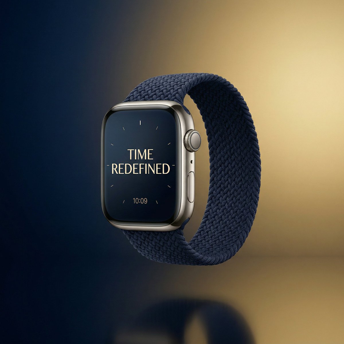 洗練されたミニマリストな空間に、最新のスマートウォッチが浮遊している広告ビジュアル。背景は深みのあるネイビーとゴールドのグラデーション。スマートウォッチの画面には『{argument name="スマートウォッチの文字" default="Time Redefined"}』という文字が表示されている。