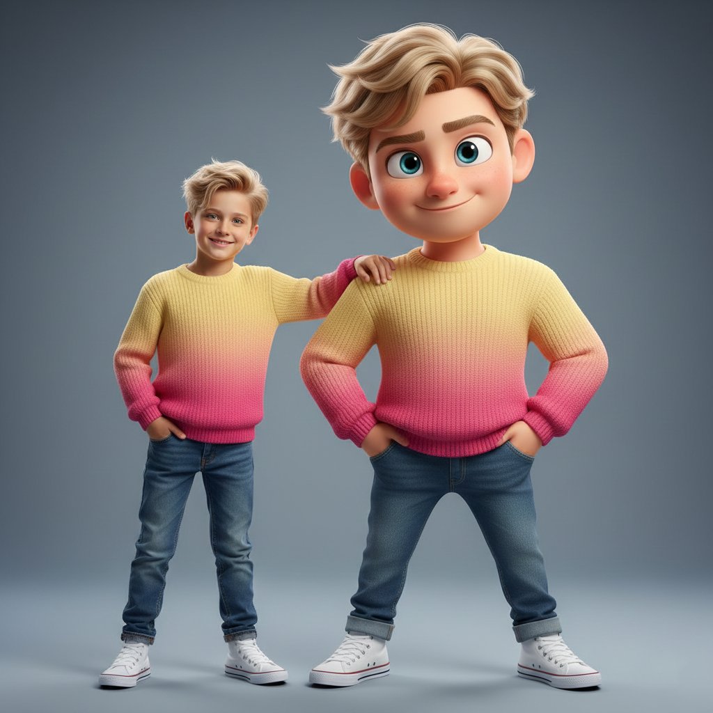 Ultra-high-quality hyper-realistic photo featuring a real human and a giant 3D Pixar-style version of THE SAME person — both strictly based on the uploaded reference image. The real person and the Pixar character must have identical facial structure, hairstyle, facial expression, body proportions, height, and clothing. Both are wearing a knitted sweater with a gradient from light yellow to pink, high-waisted blue jeans, and white high-top sneakers. The pose must exactly match the reference: the real person stands relaxed with a friendly smile, with their hand naturally resting on the shoulder of the Pixar character. The Pixar version stands slightly wider, arms confidently positioned near the pockets, with a playful sly smirk, one raised eyebrow, and expressive Pixar-style eyes. The Pixar character should be proportionally larger, but anatomically identical to the real person. The facial expression, head tilt, posture, and body language must precisely replicate the reference image. Clean gray-blue studio background, soft even studio lighting, realistic shadows, crisp fabric texture, smooth Pixar-style skin shading, cinematic sharpness. DO NOT change the pose, reaction, clothing, or proportions. Strict adherence to the reference.