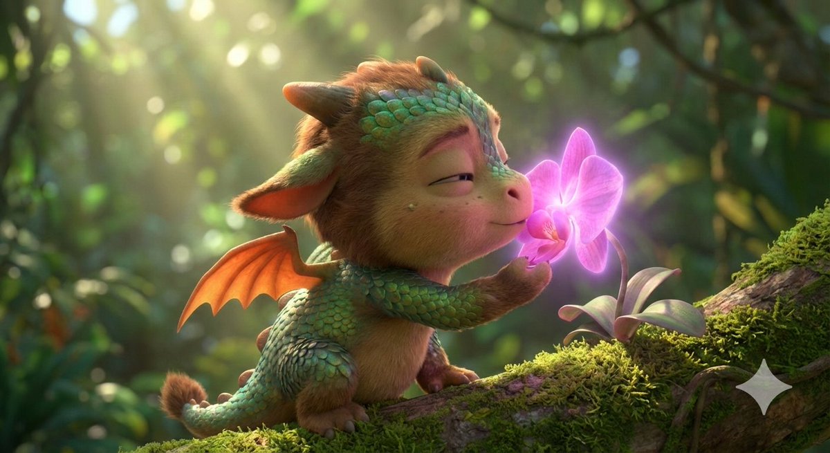 "composition": "Close-up shot focusing on the creature's endearing expression and the contrast between fur and scale textures."