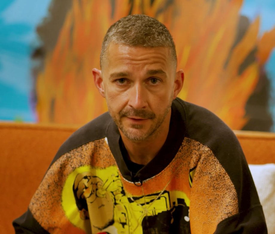 Replace the grey shirt man in image 1 with the orange sweater man from image 2. Match the exact pose from image 1 Remove the caption text "HEY COME HERE" Remove the black from the top right corner