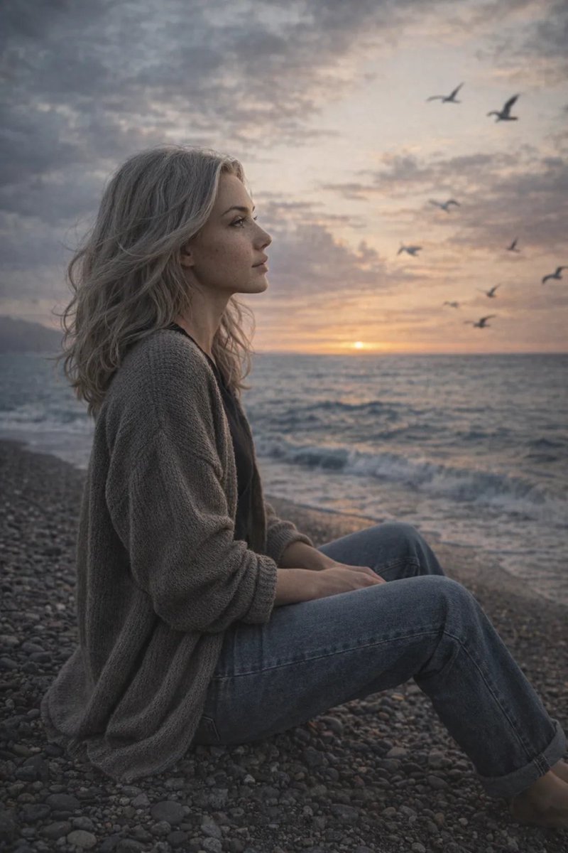 Cinematic seaside scene at sunset with a dramatic, cloud-filled sky. The palette blends cool blue-gray atmospheric tones with a soft peach glow near the horizon. The person sits sideways on a pebbled beach close to the shoreline, body oriented toward the sea, gaze directed over the water. Posture natural and relaxed, anatomically correct, no exaggerated posing. A light coastal breeze creates subtle environmental movement — gentle fabric motion and natural interaction with the surroundings. Seagulls circle in the sky, some with slight motion blur for realistic depth and spatial layering. Wardrobe is minimal and neutral: a dark basic T-shirt layered under a loose knitted cardigan, paired with relaxed straight-leg jeans. Fabrics must show realistic textile behavior — visible knit texture, natural folds, weight, gravity tension at elbows and waist, authentic denim structure and stitching details. Lighting is soft natural sunset light with realistic falloff. Subtle rim light from the horizon, balanced exposure on skin without over-smoothing. Shadows remain matte and dimensional. Shot with a photographer’s mindset — 35mm lens look, natural perspective, shallow but believable depth of field. Vintage film-inspired color science reminiscent of Kodak Portra 400: soft contrast, muted highlights, matte shadows, mild desaturation, organic film grain. Editorial framing, high photorealism, 4K resolution.
