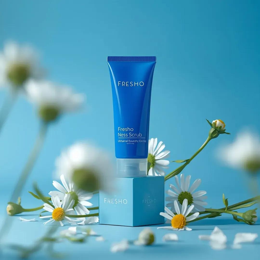 Ultra-realistic commercial skincare product photography featuring a vibrant cobalt-blue squeeze tube labeled “{argument name="product name" default="Fresho – Fresho Ness Scrub"}” standing upright at the center of the frame. The tube has a glossy finish with clean white typography and a translucent flip-top cap, and it is placed on top of a matching blue product box that subtly displays the brand name on its side. The background is a seamless bright blue studio backdrop that enhances the monochromatic aesthetic.