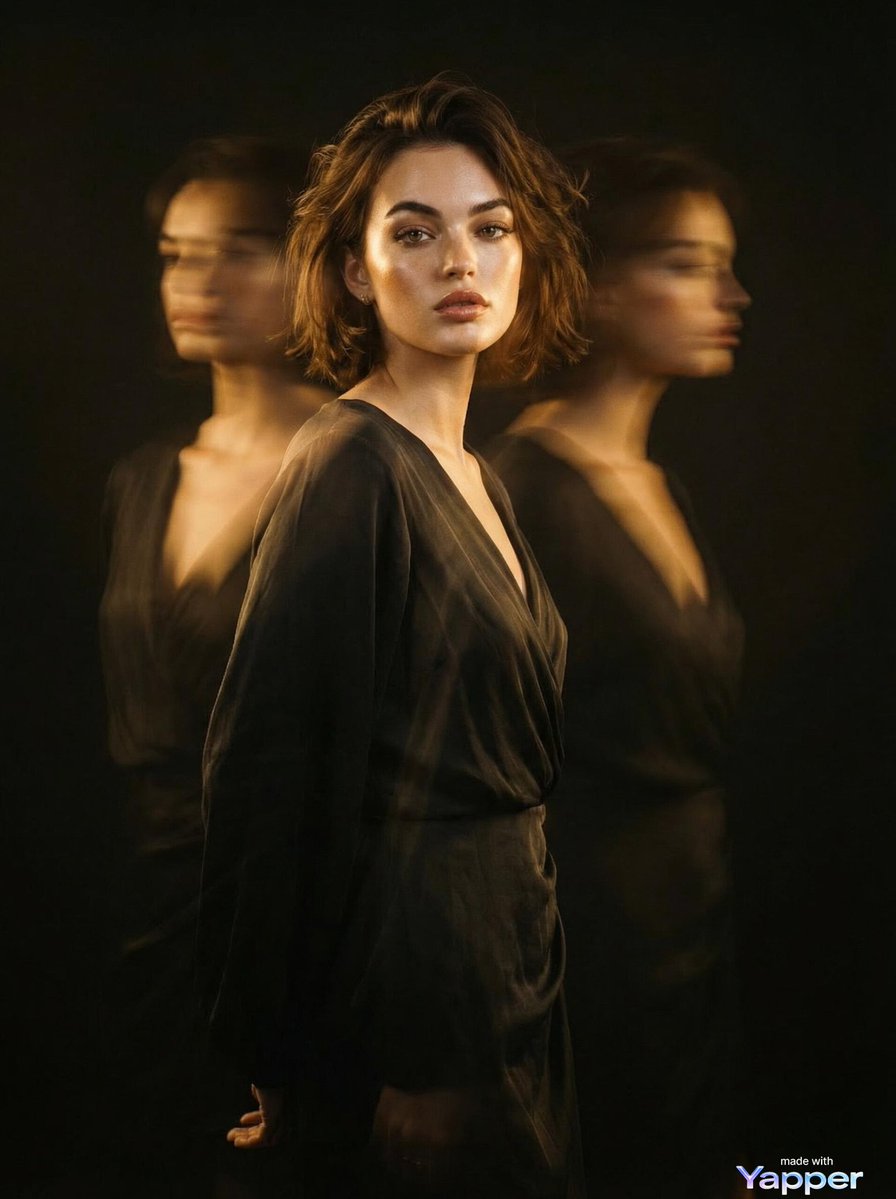 A Cinematic fashion portrait of an elegant young woman in a beautiful veteran dress, soft draped fabric, short tousled brown hair, glowing skin, dramatic makeup, warm golden lighting, standing in a dark moody studio. Motion blur ghost figures moving around her creating a surreal double-exposure effect, dreamy atmosphere, long exposure photography, shallow depth of field, high fashion editorial style, soft shadows, luxury aesthetic, film photography look, 85mm lens, ultra detailed, volumetric light, Vogue photoshoot style.