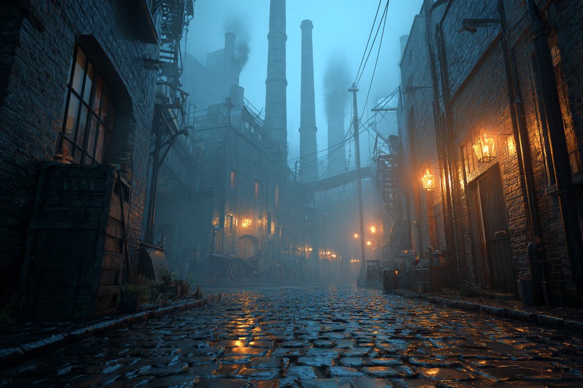 [SUBJECT] set during the Foggy Industrial Revolution, with smoke stacks and mist enveloping machinery. Use gritty textures and a palette of smoggy [COLOR1] and [COLOR2] to convey the era's mood and mystery.