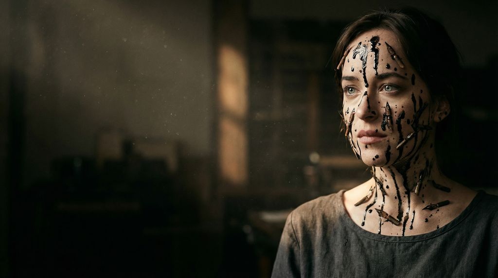 "master_prompt": "A hyper-realistic, surreal editorial portrait of The Melancholic Prodigy, captured in a dimly lit, dust-filled antique letterpress workshop. The protagonist is framed strictly according to the Cinematic Rule of Thirds, positioned on the far right, leaving vast, moody negative space to the left. The subject exhibits a 'sorrowful focus,' staring past the lens. SURREAL VISUAL TRANSLATION: mirroring the dense, swarming geometry of the reference image, the subject's face and neck are not covered in spiders, but in viscous, anti-gravity droplets of black India ink and broken, antique calligraphy nibs that cling to the skin like organic parasites. These elements cast realistic, micro-shadows on the pores, treating the surrealism as a practical effect. The lighting is a high-contrast Chiaroscuro: a single, warm shaft of light cuts through the airborne dust particles, illuminating the glossy texture of the ink against the matte skin, while the rest falls into deep shadow. Shot on a Hasselblad H6D-100c with an HC 100mm f/2.2 lens to achieve a razor-thin depth of field, focusing intensely on the eyes and the tactile ink texture. Film simulation: Kodak Portra 800, rich grain, desaturated slightly to emphasize the melancholic atmosphere. No neon, no digital gloss.",
