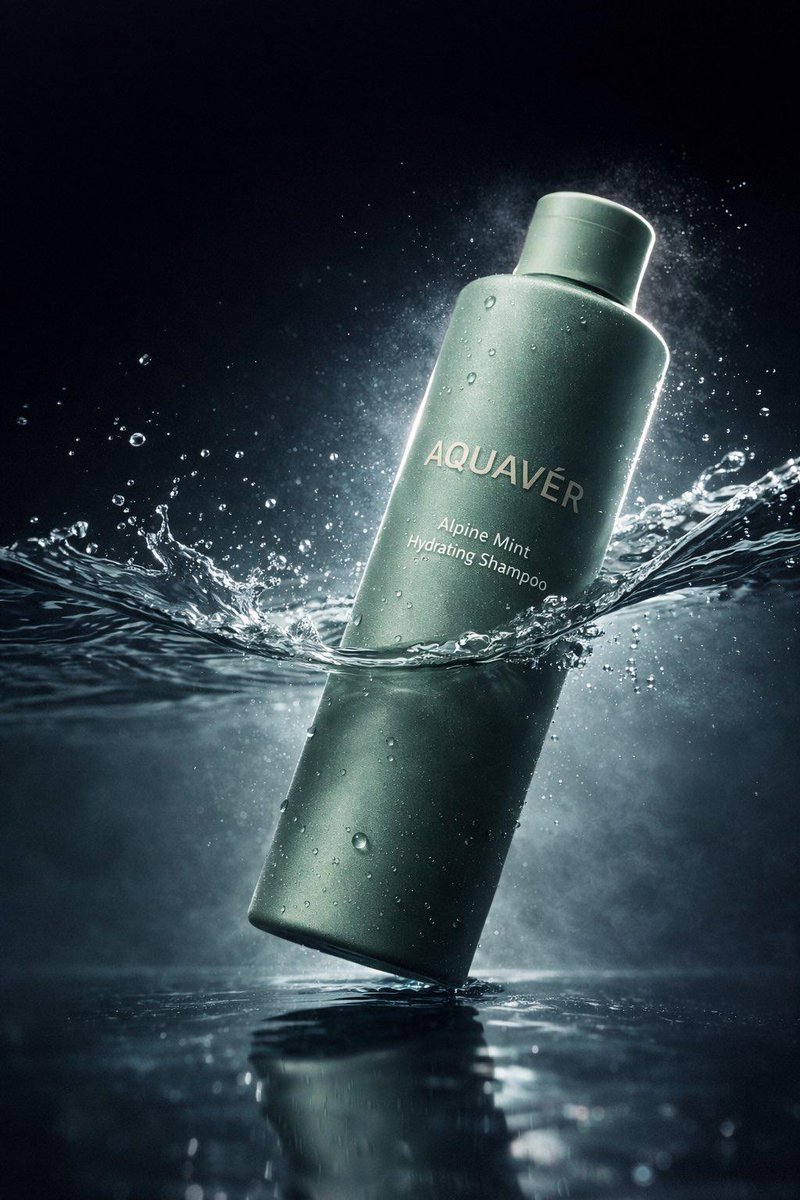 Ultra-realistic luxury shampoo bottle (matte green, minimal branding) splashing through crystal-clear water, dynamic liquid motion frozen mid-air, detailed droplets and mist, glossy reflections on wet surface, cinematic studio lighting with cool blue tones, soft glow rim light, dark gradient background, high-speed photography, ultra-sharp focus, premium skincare advertising style, clean composition, 8K.