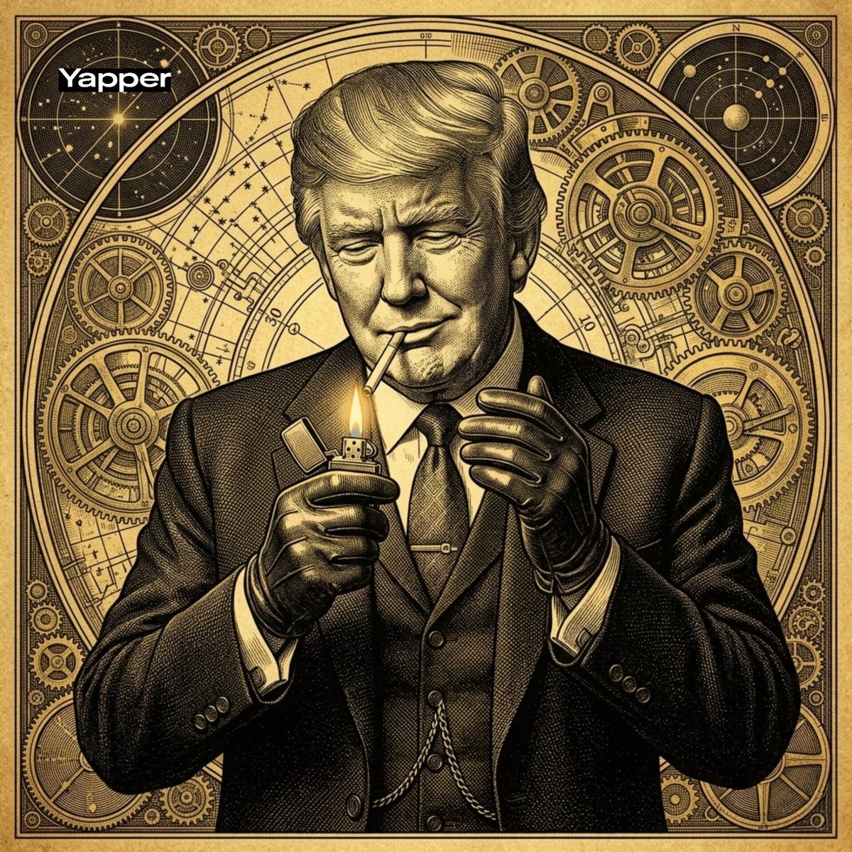 Ultra-detailed vintage engraved illustration of Donald Trump in a dark tailored three-piece suit with a tie and pocket watch chain, wearing black leather gloves while lighting a cigarette with a metal lighter. His expression is serious and contemplative, head slightly tilted downward as the flame illuminates his face. The background features intricate steampunk-style mechanical diagrams, antique clockwork gears, and celestial navigation charts forming a complex circular pattern behind him. Dramatic chiaroscuro lighting, golden sepia tones, highly textured cross-hatching engraving style, Victorian-era etching aesthetic, extremely detailed line work, cinematic contrast, moody atmosphere, 8k detail, masterpiece illustration.