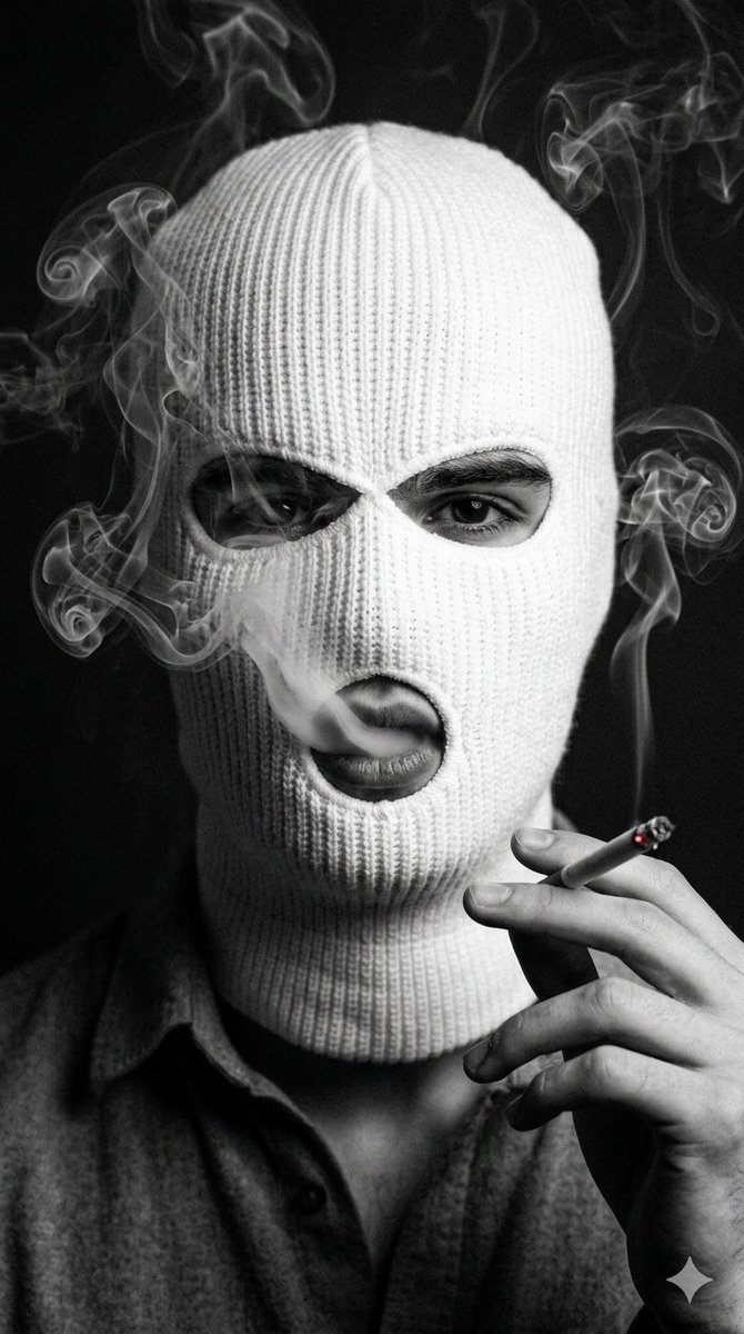 A dark, mysterious noir style portrait. In the center is a young man wearing a tight white knitted ribbed balaclava mask, leaving only the eyes and mouth visible. The bright white mask contrasts strongly with the dark background. One intense male eye with subtle dark eyeliner looks directly at the camera. Through the lower opening, masculine lips release thick swirling cigarette smoke.