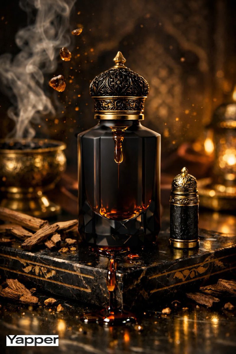 "oil_texture": "deep amber oud oil with rich glossy viscosity and warm golden reflections"