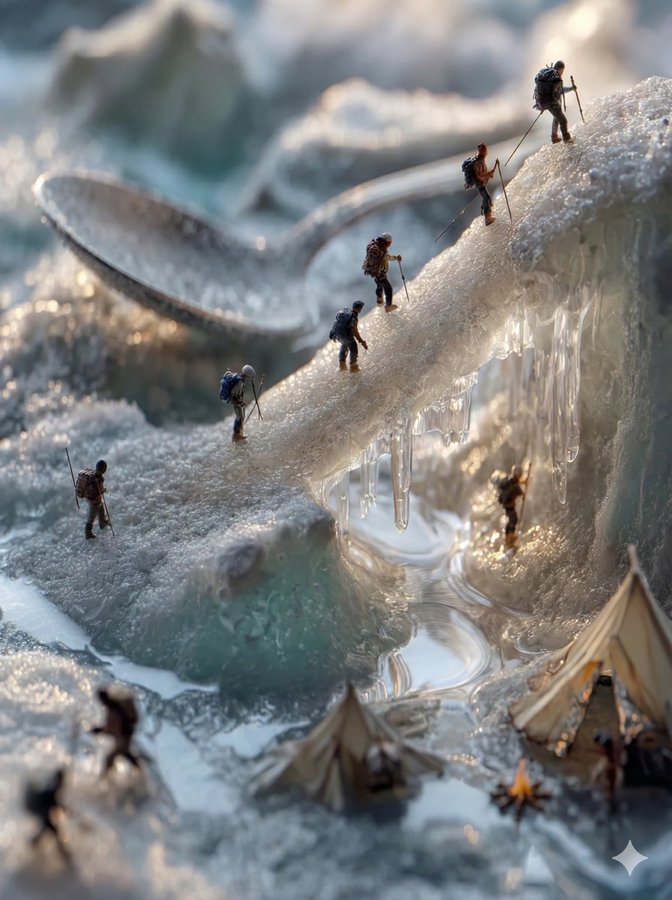 "background": "Fallen spoon acting as a frozen bridge",