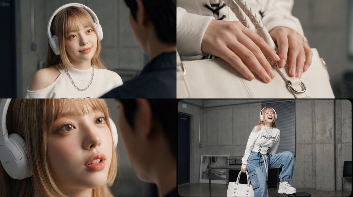 友達との雑談を通して女性の可愛らしさを描く、4カット構成のシネマティックな映像。ミディアムショットでの笑顔、手元のASMR音、ささやき声のクローズアップ、そして余韻のある引きのショットをシームレスに繋ぐ。フィルムライクな質感とバイノーラル音響を組み合わせ、視覚と聴覚の両面から没入感を高める構成にする。